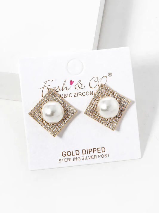 18k Gold Dipped CZ Pave Curved Square With 9mm Pearl Stud Earrings