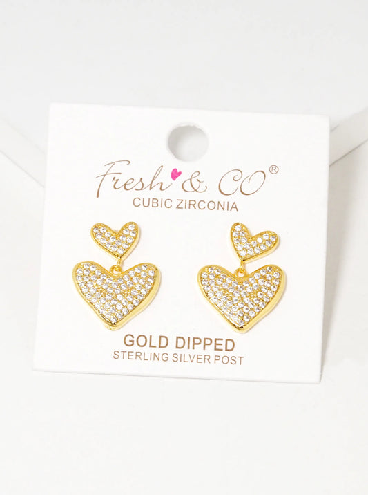 18K Gold Dipped CZ Pave Double Heart Drop Dangle Earrings