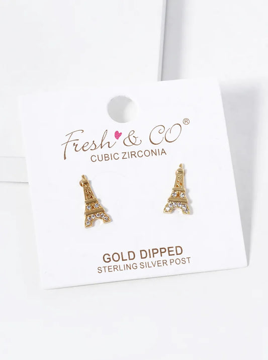 18k Gold Dipped CZ Pave Eiffel Tower Stud Earrings