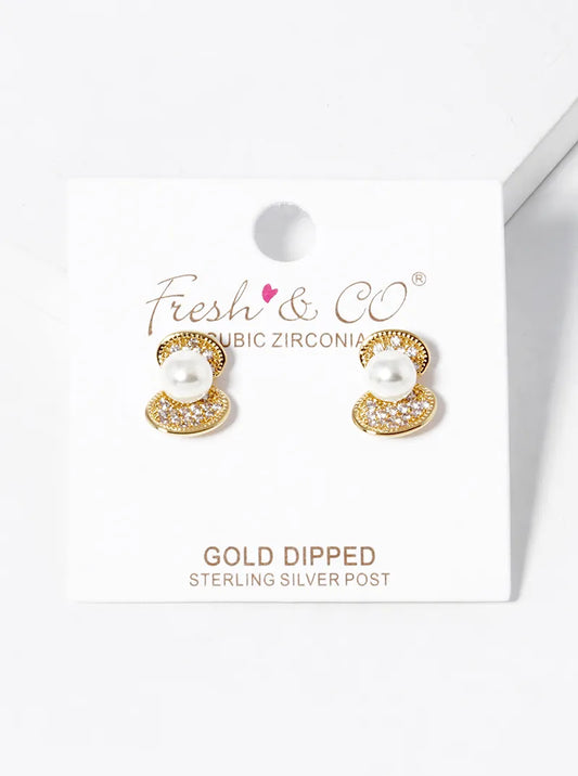 18k Gold Dipped CZ Pave Shell With Pearls Stud Earrings