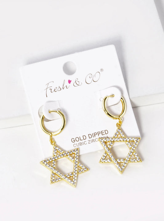 18K Gold Dipped CZ Pave Star Of David Drop 12mm Huggie Hoop Earrings
