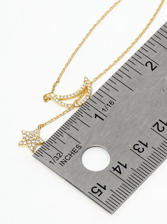 18k Gold Dipped CZ Pave Star And Moon Pendant Lariat Necklace