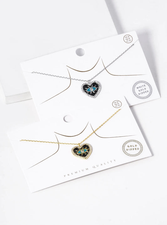 18k Gold Dipped Enamel Evil Eye In CZ Pave Heart Pendant Necklace