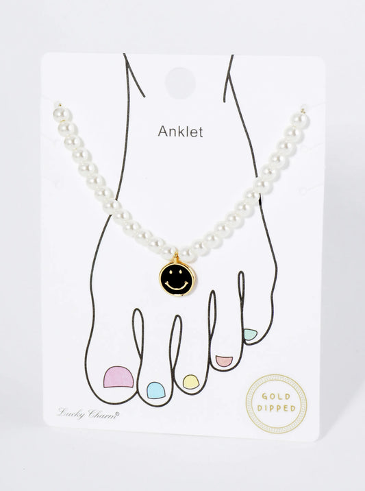 18K Gold Dipped Enamel Smiley Face Charm Pearl Chain Anklet