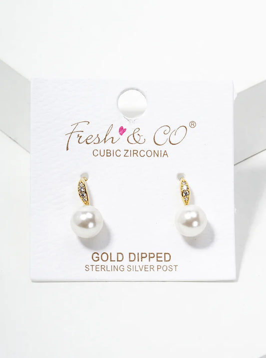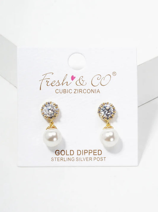 18k Gold Dipped Glass Pearl Drop CZ Dangle Post Earrings