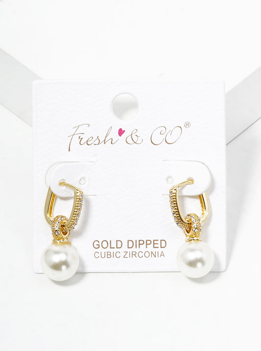 18K Gold Dipped Glass Pearl Drop CZ Pave Earrings