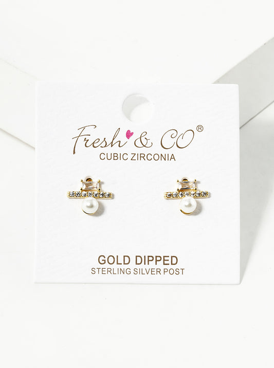 18k Gold Dipped Geometric CZ Bar Pearl Post Stud Earrings