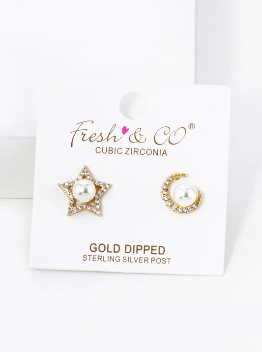 18K Gold Dipped Micro Pave Cubic Zirconia With Pearl Star And Moon Asymmetrical Stud Earrings