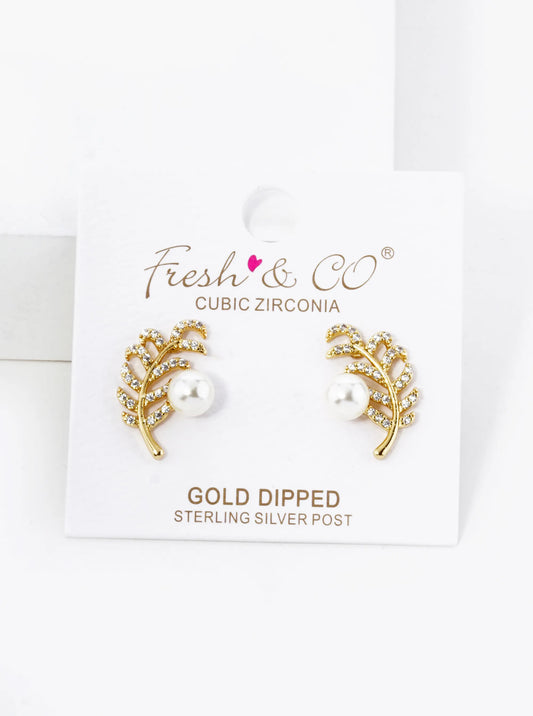 18K Gold Dipped Micro Pave Set Cubic Zirconia Feather And Pearl Stud Earrings