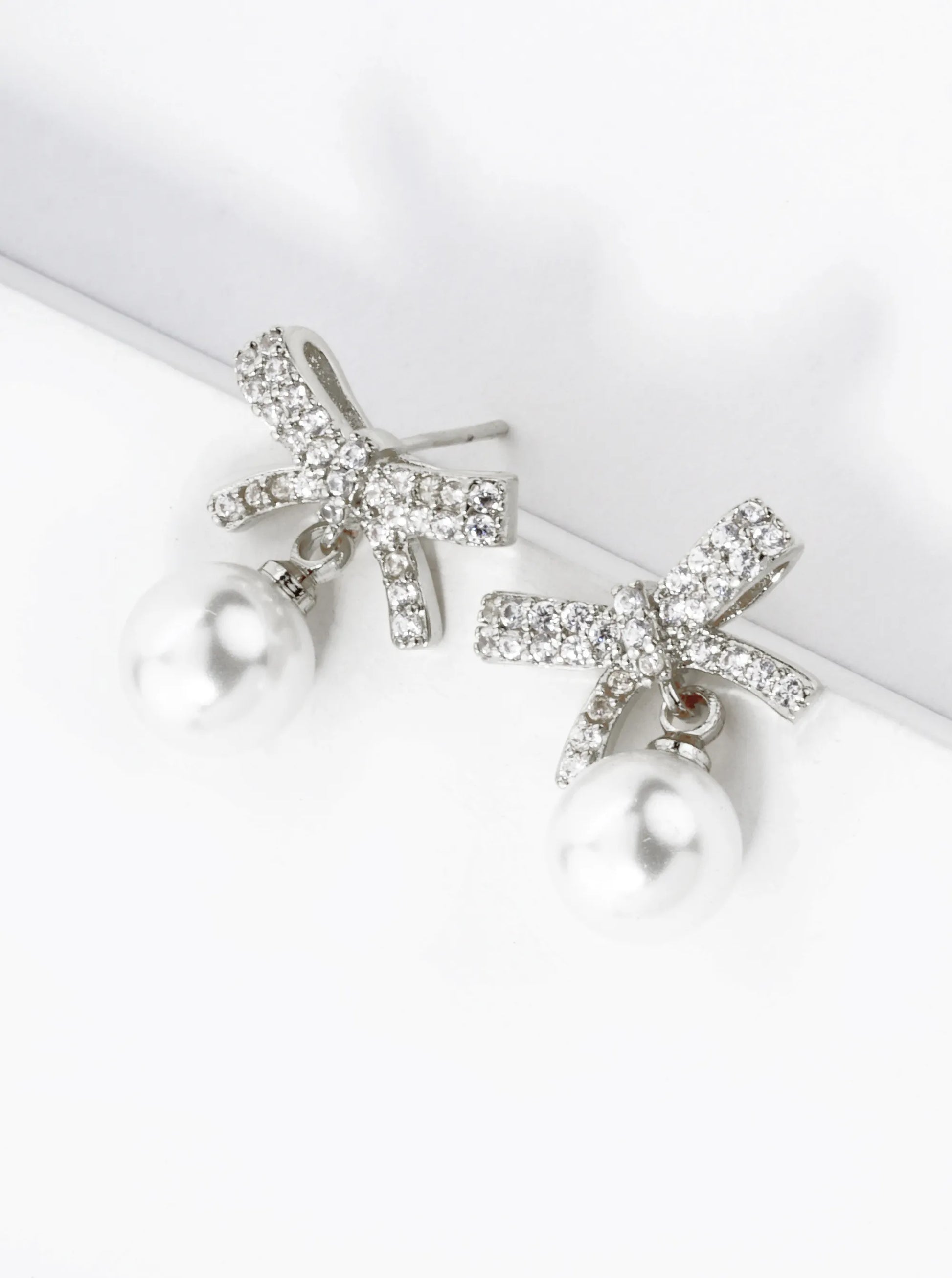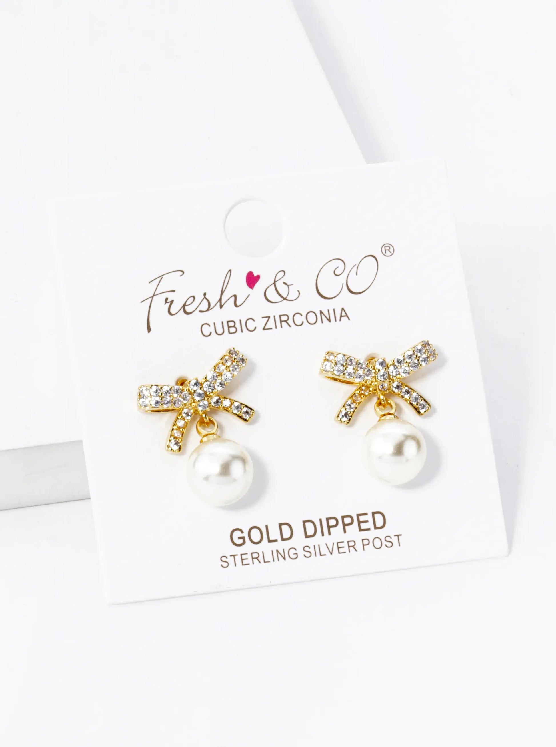 18K Gold Dipped 7mm Pearl Drop Micro Pave Set Cubic Zirconia Ribbon Bow Dangle Post Earrings