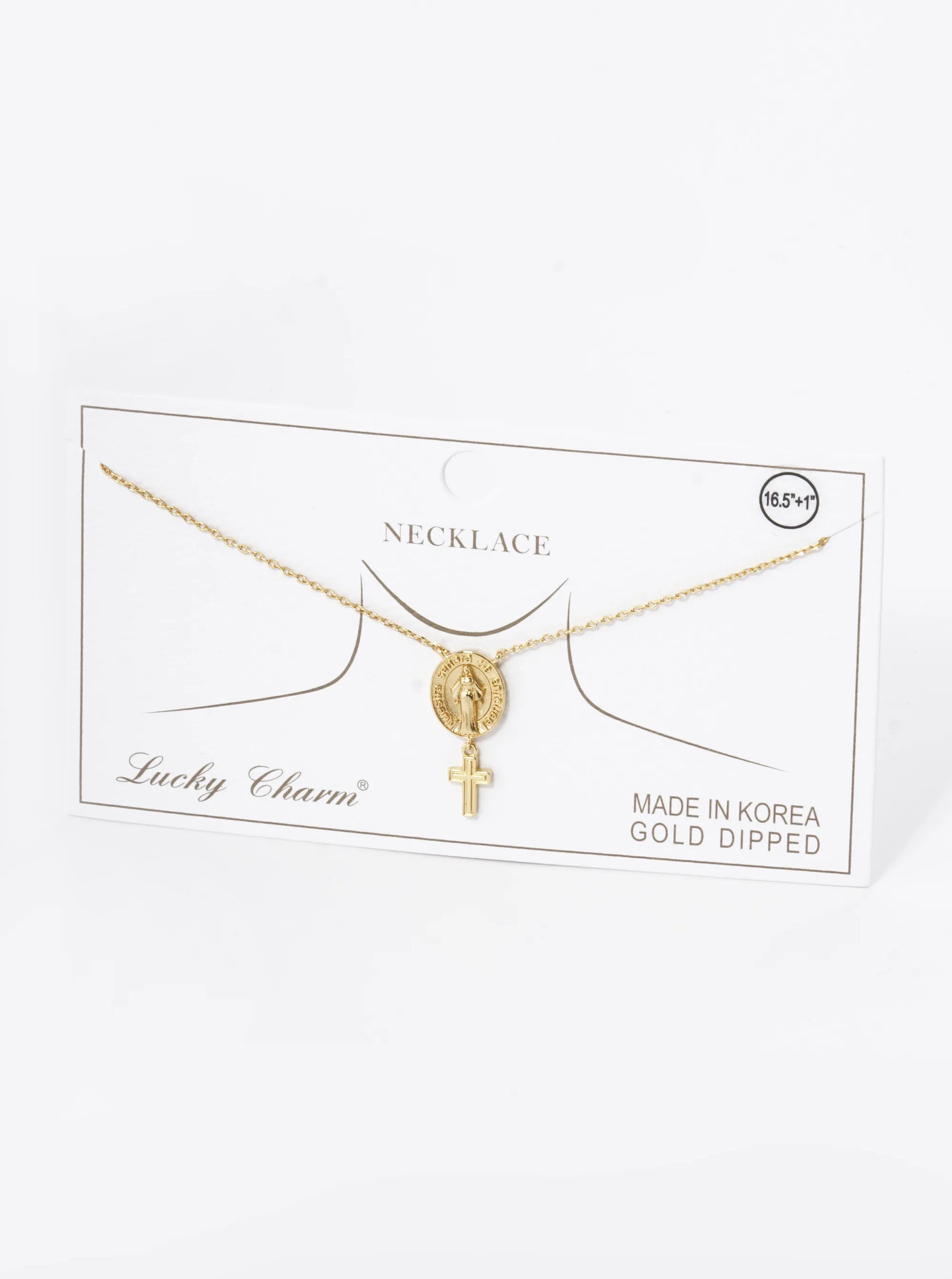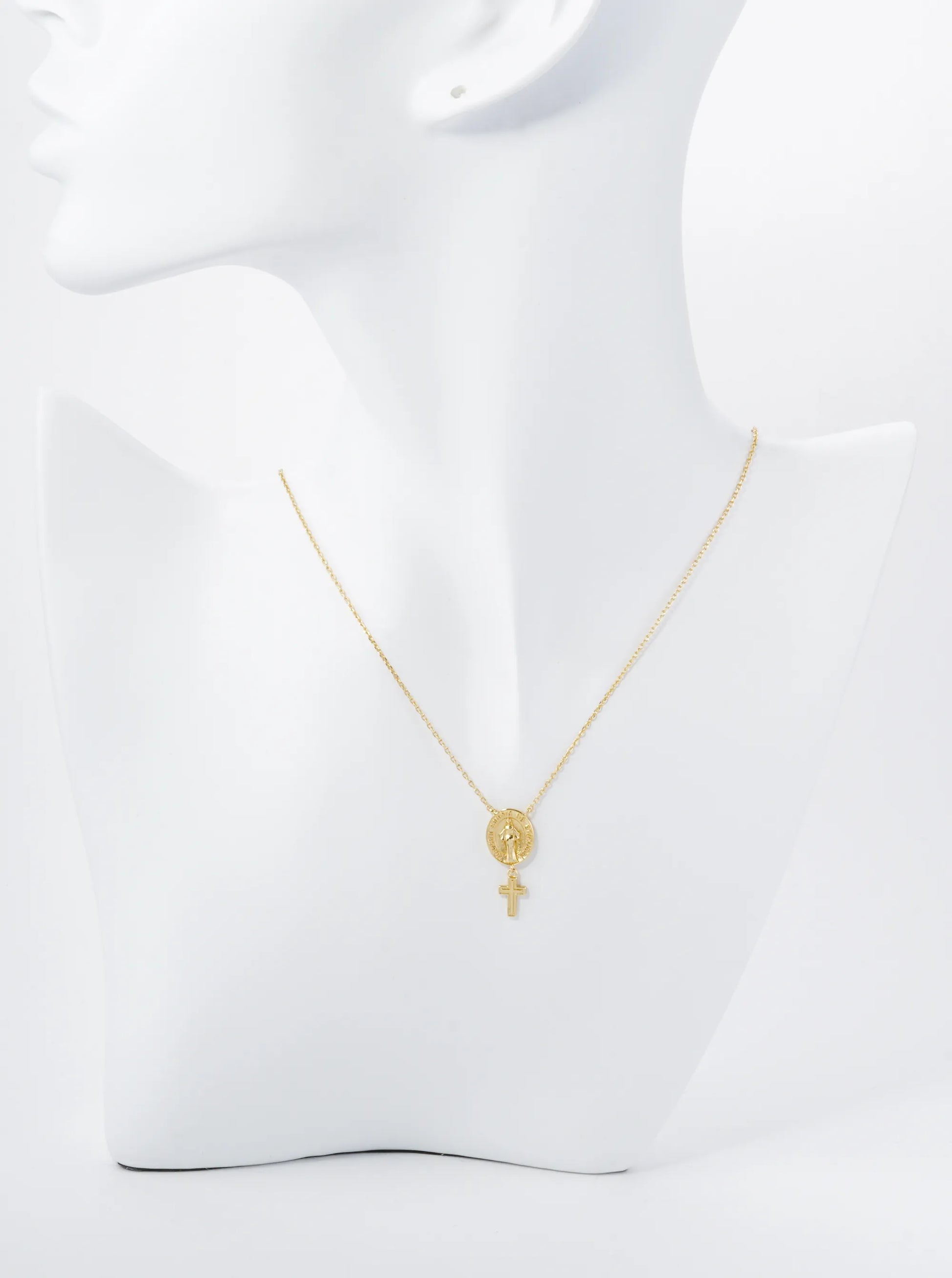 18K Gold Dipped Cross Drop Oval Miraculous Medal Religious Pendant Necklace