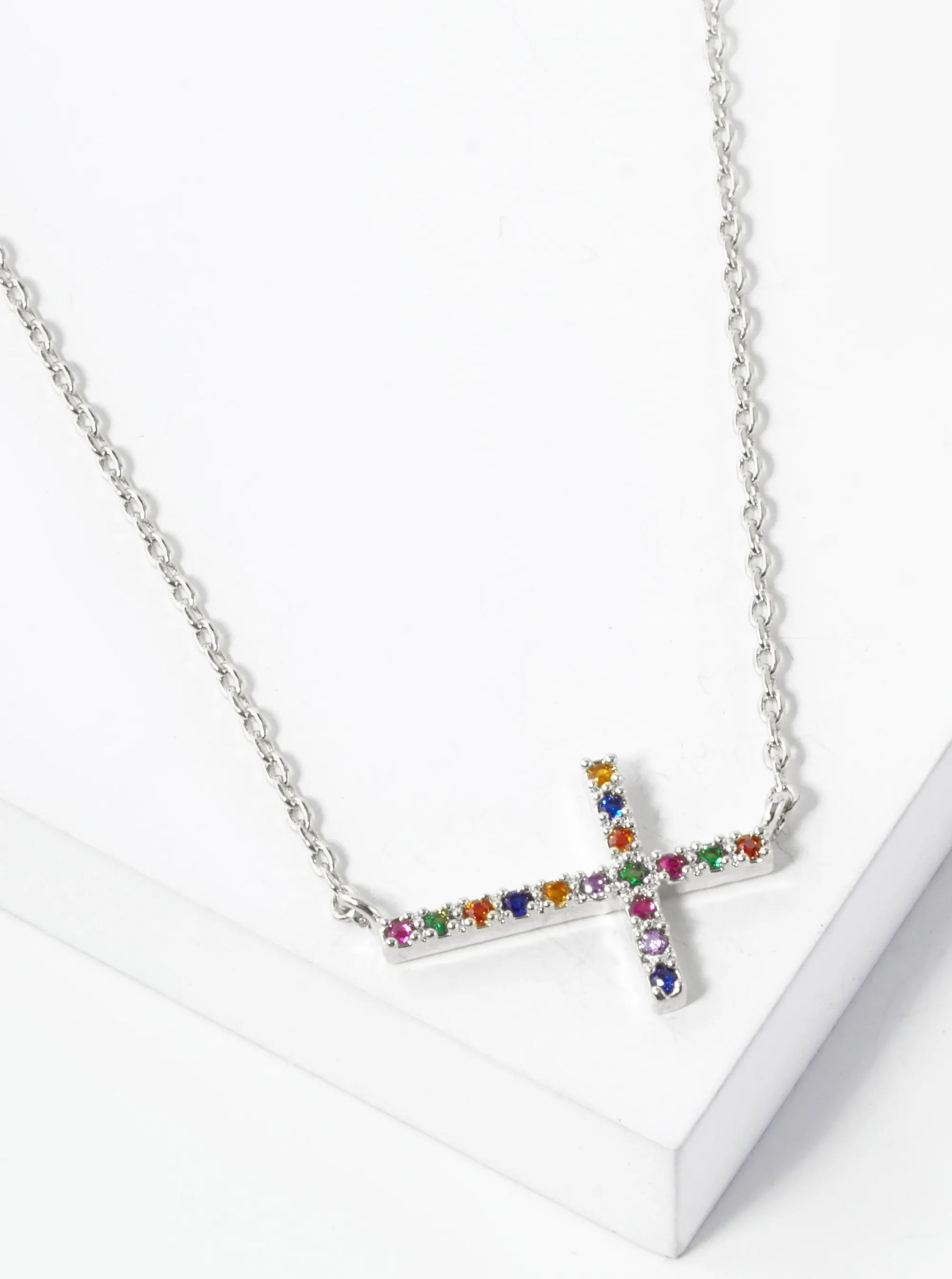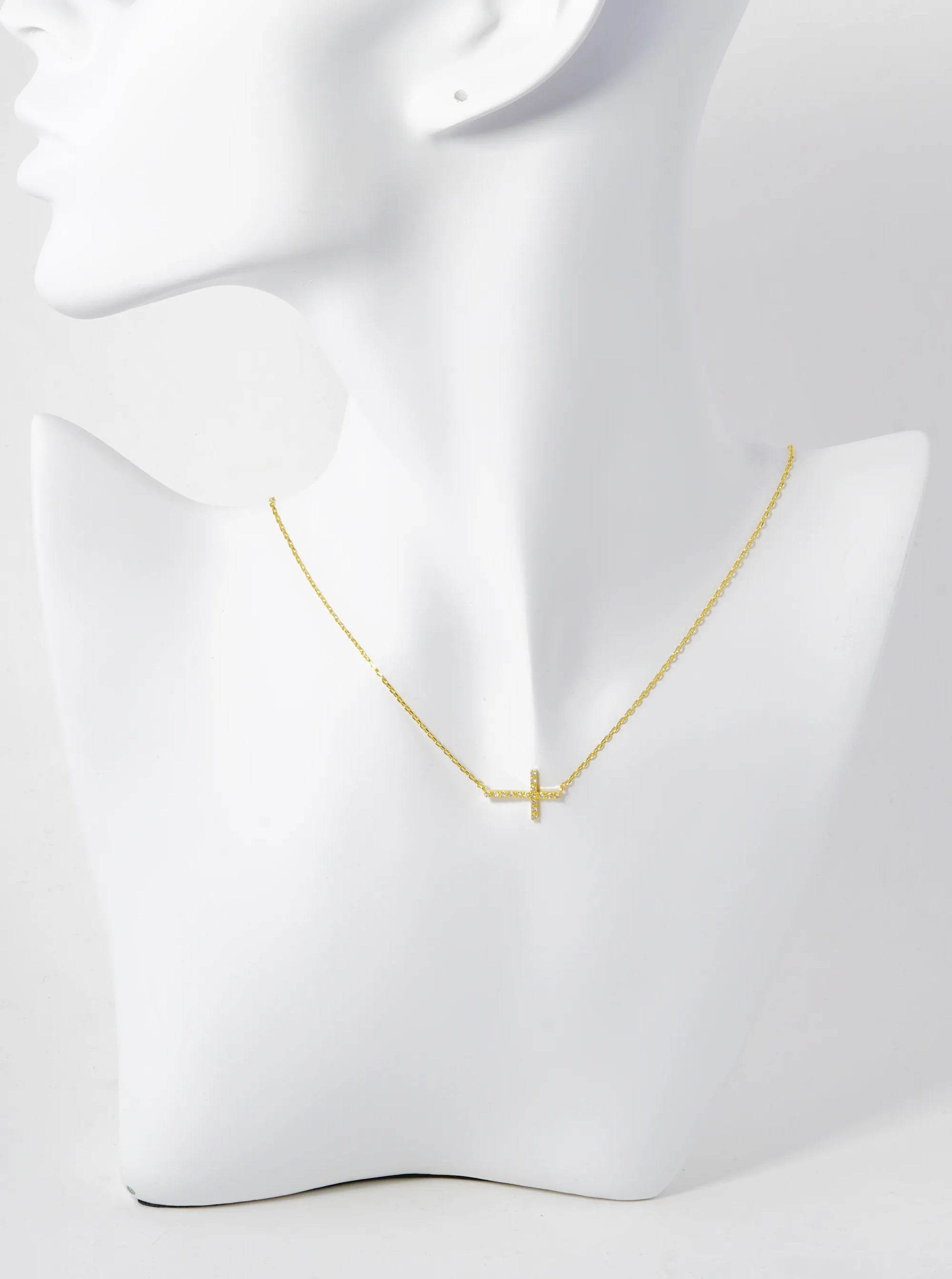 18K Gold Dipped Cubic Zirconia Pave Sideways Cross Pendant Necklace