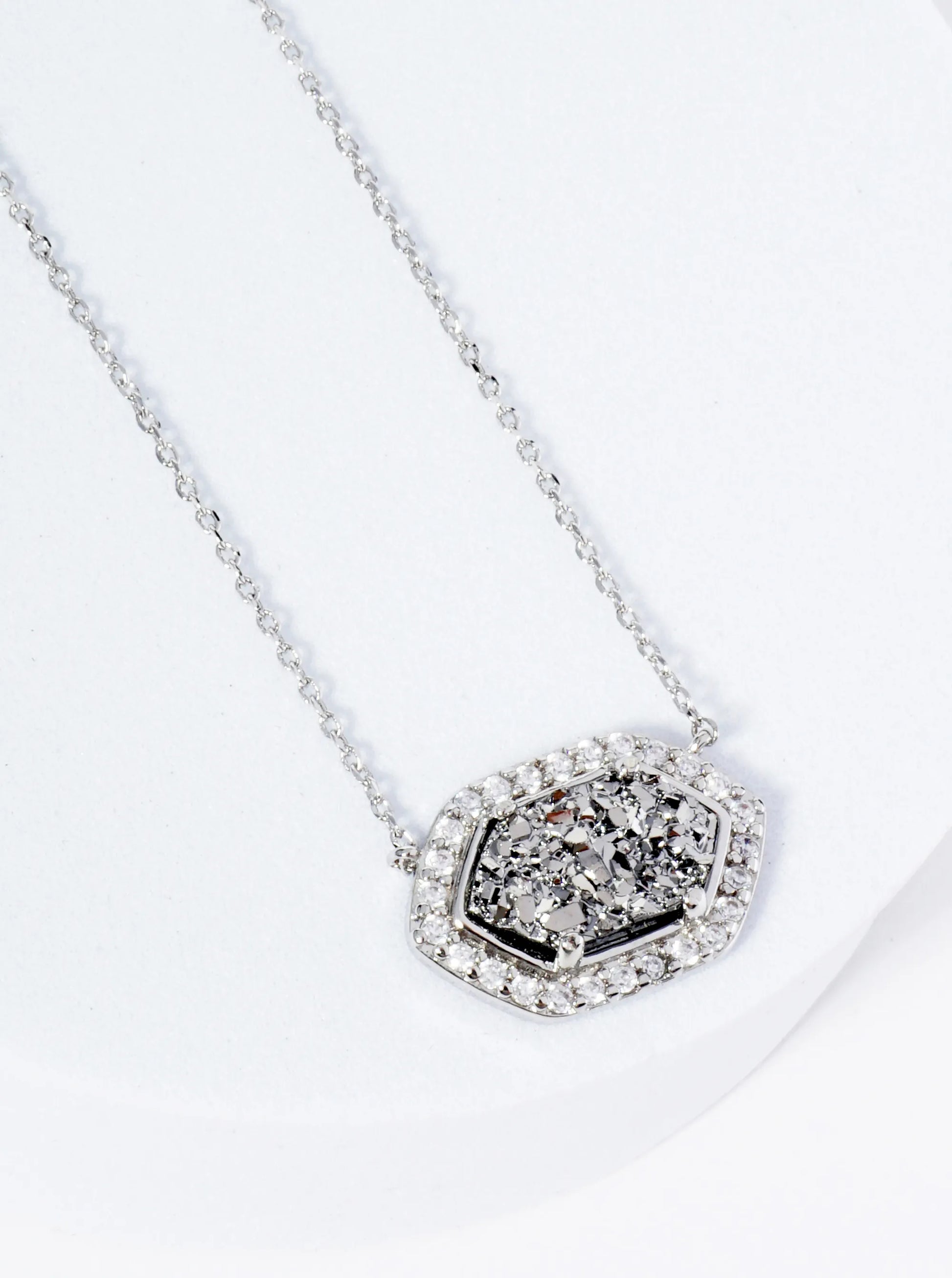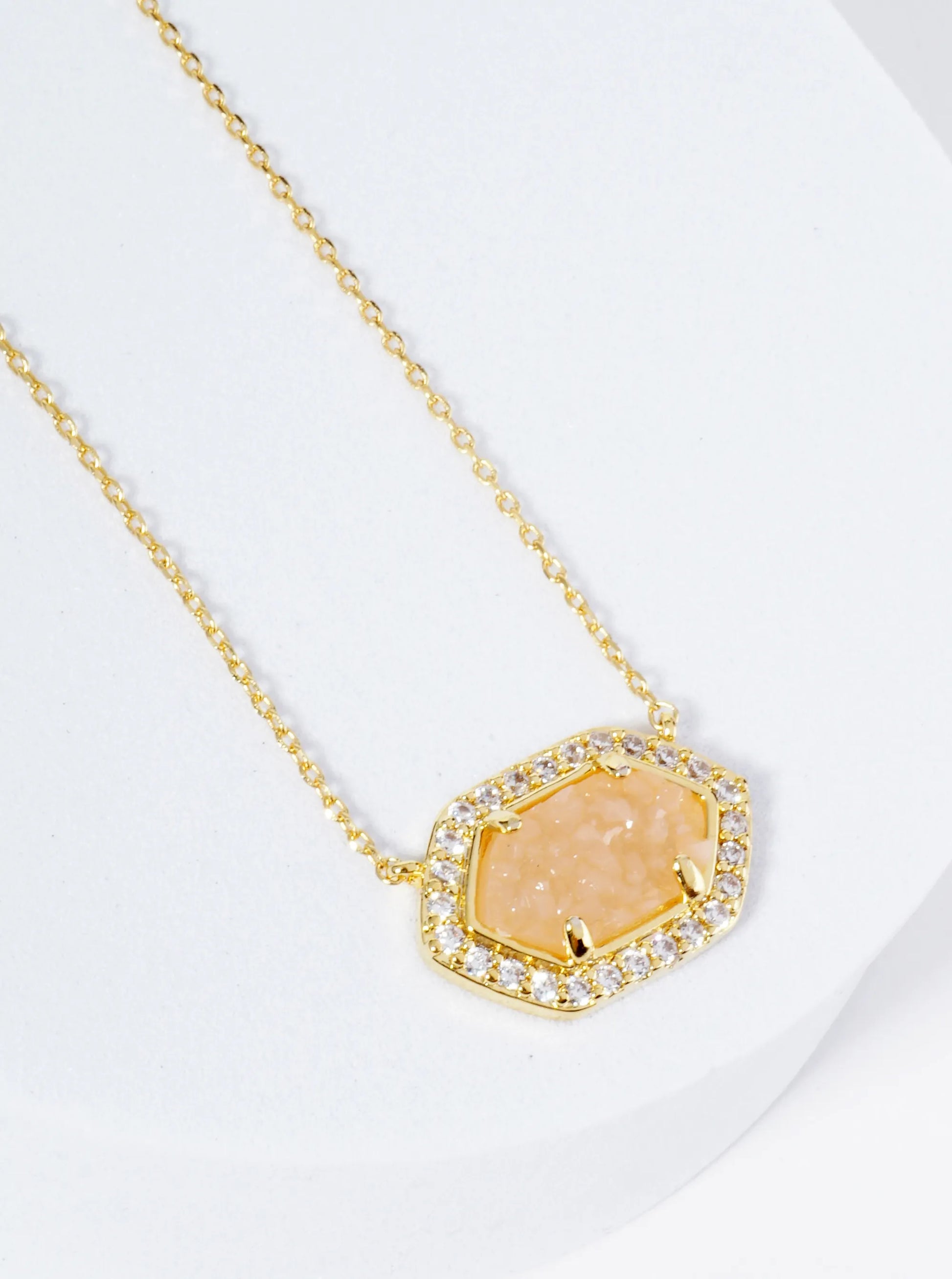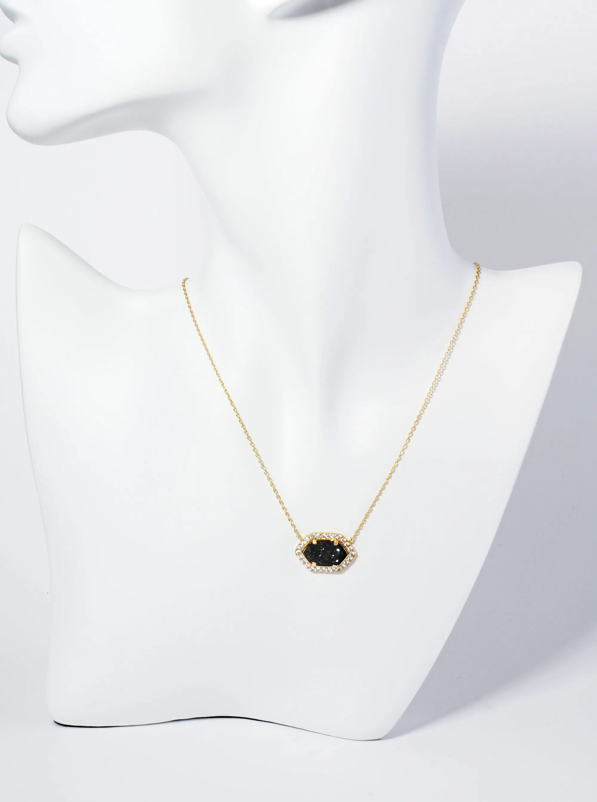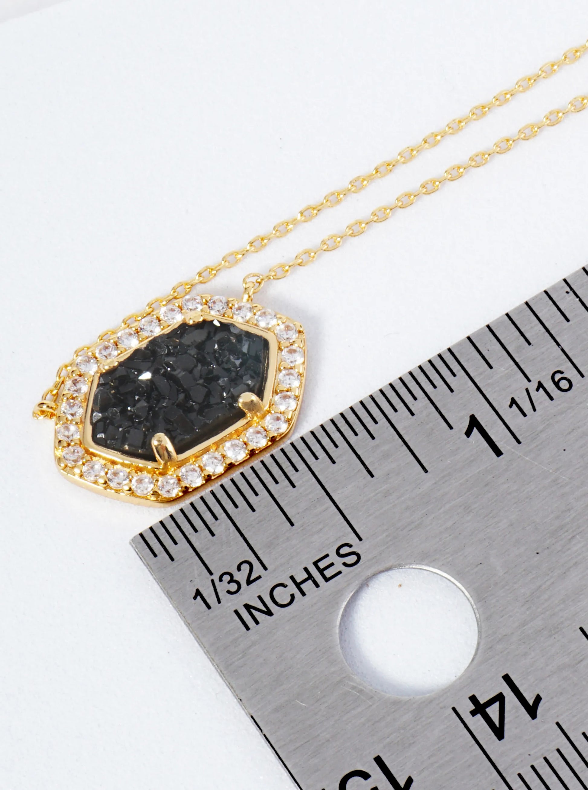 18K Gold Dipped CZ Pave Elongated Druzy Hexagon Pendant Necklace