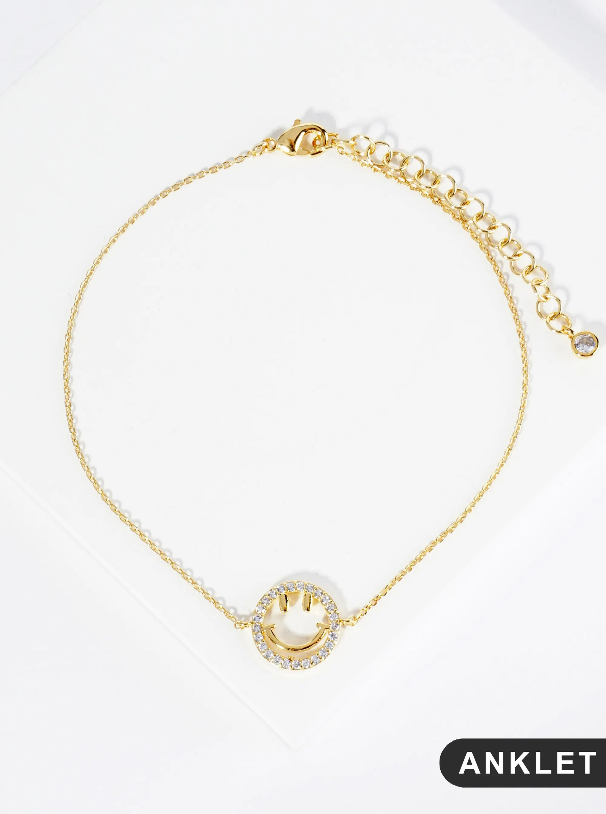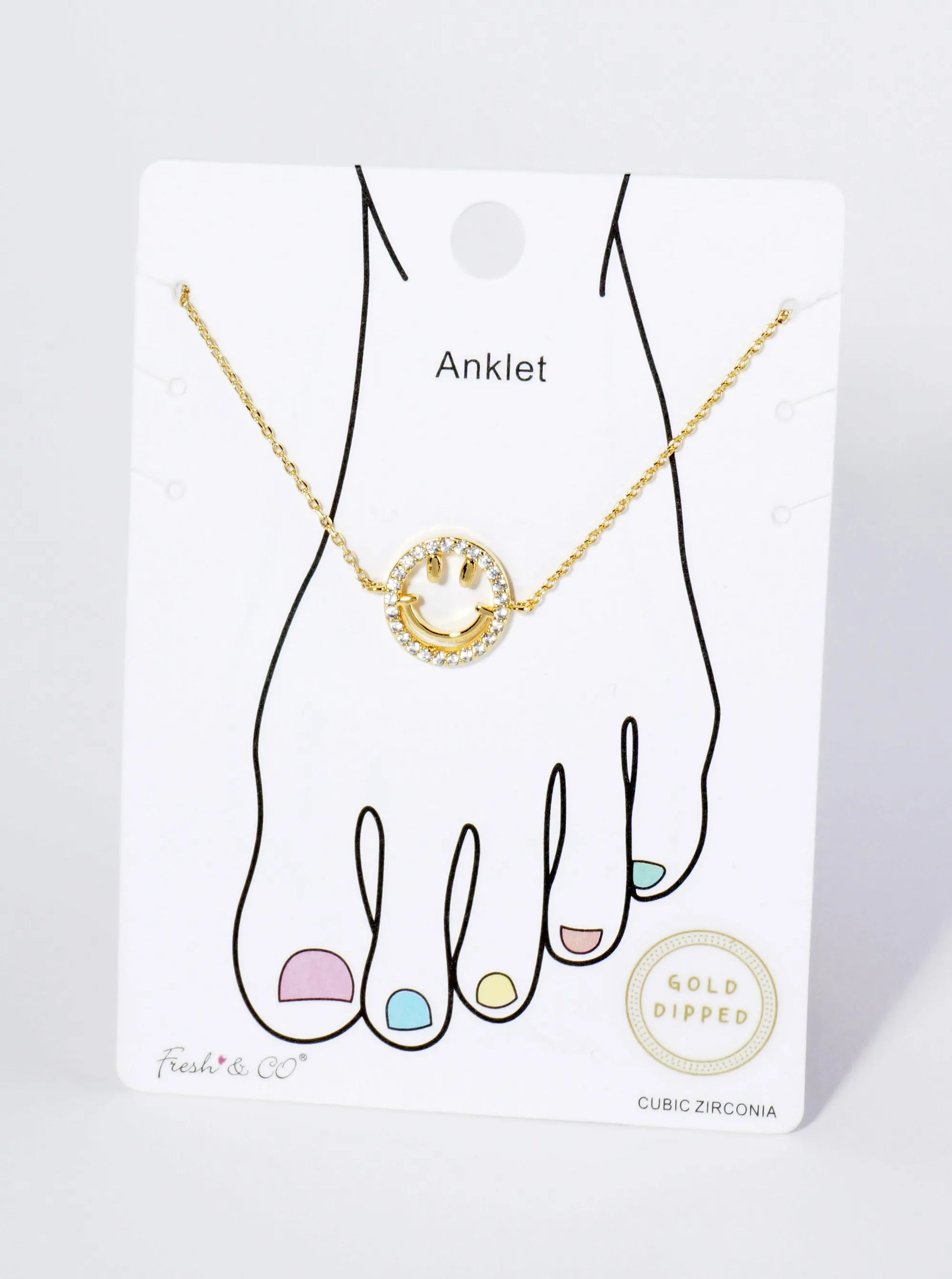 18K Gold Dipped CZ Pave Smiley Face Brass Chain Anklet