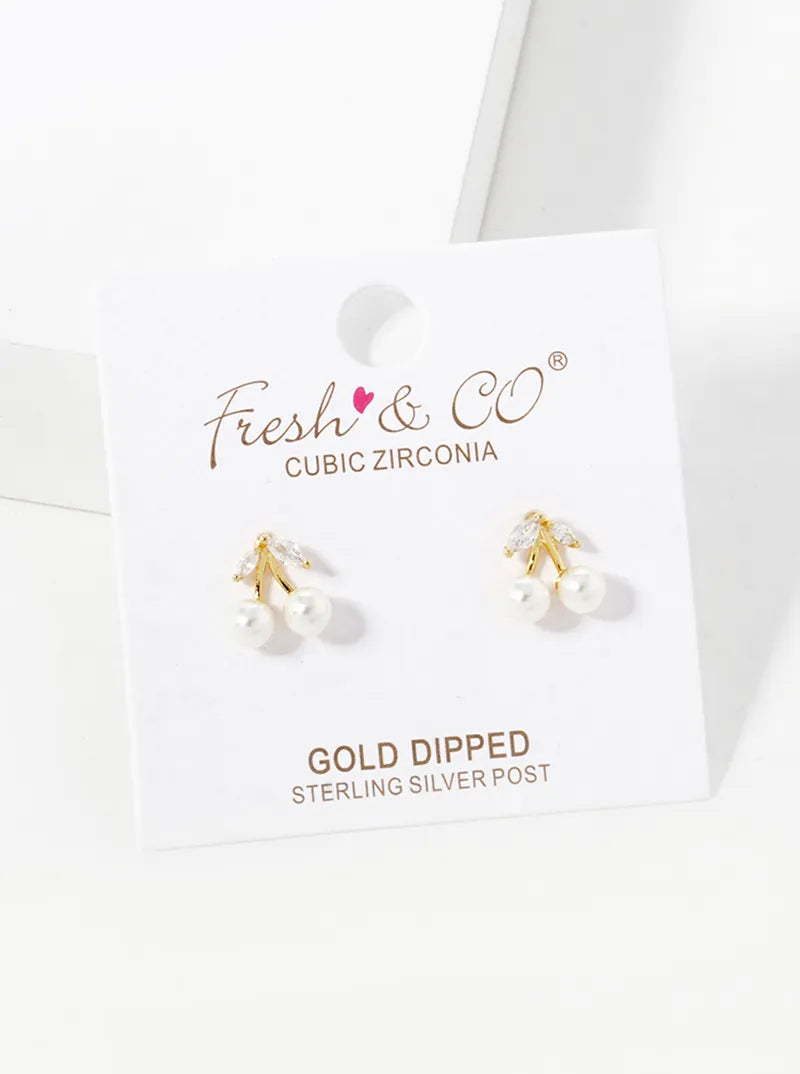 18K Gold Dipped CZ Pearl Dainty Cherry Stud Earrings