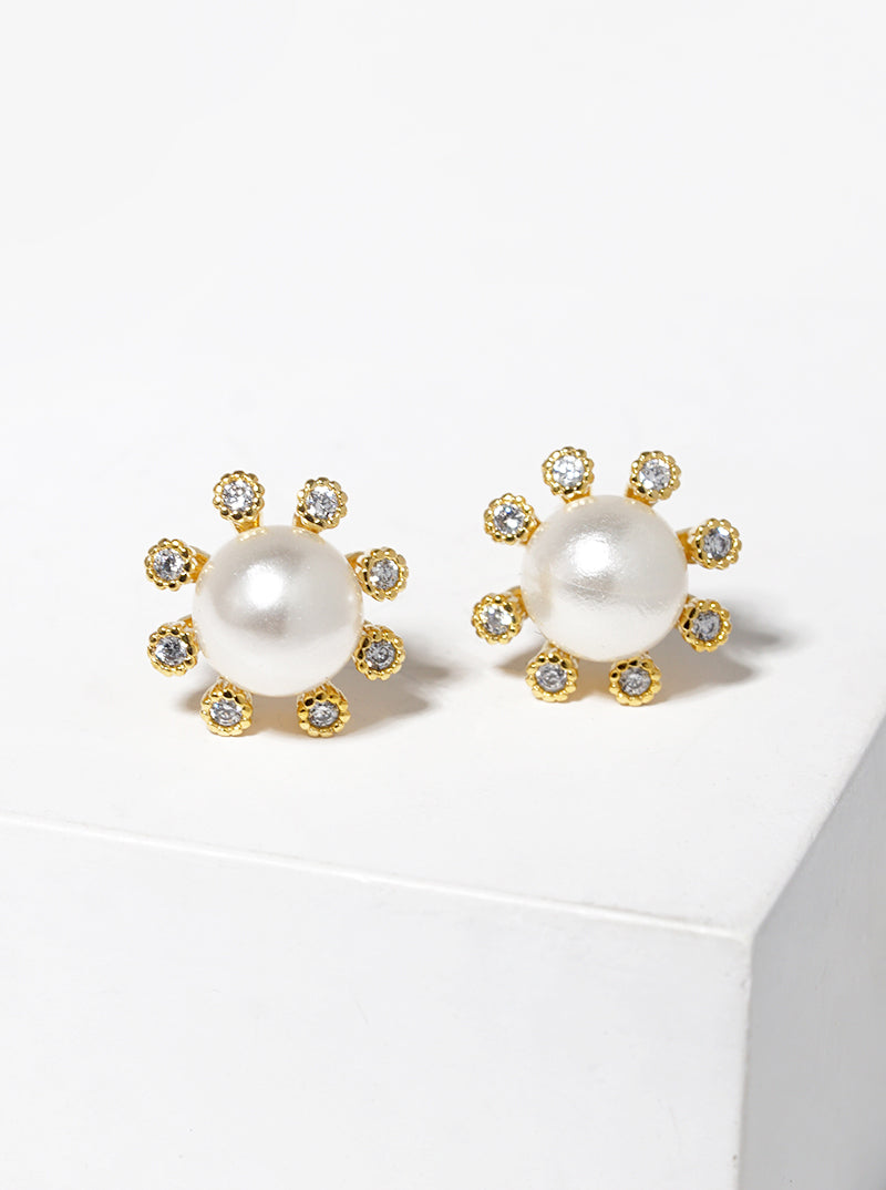 18k Gold Dipped CZ Pearl Flower Post Stud Earrings