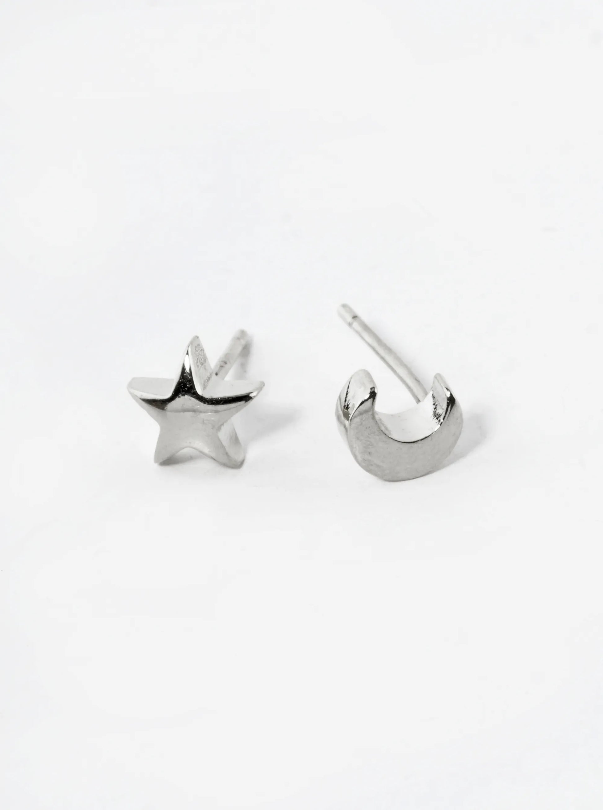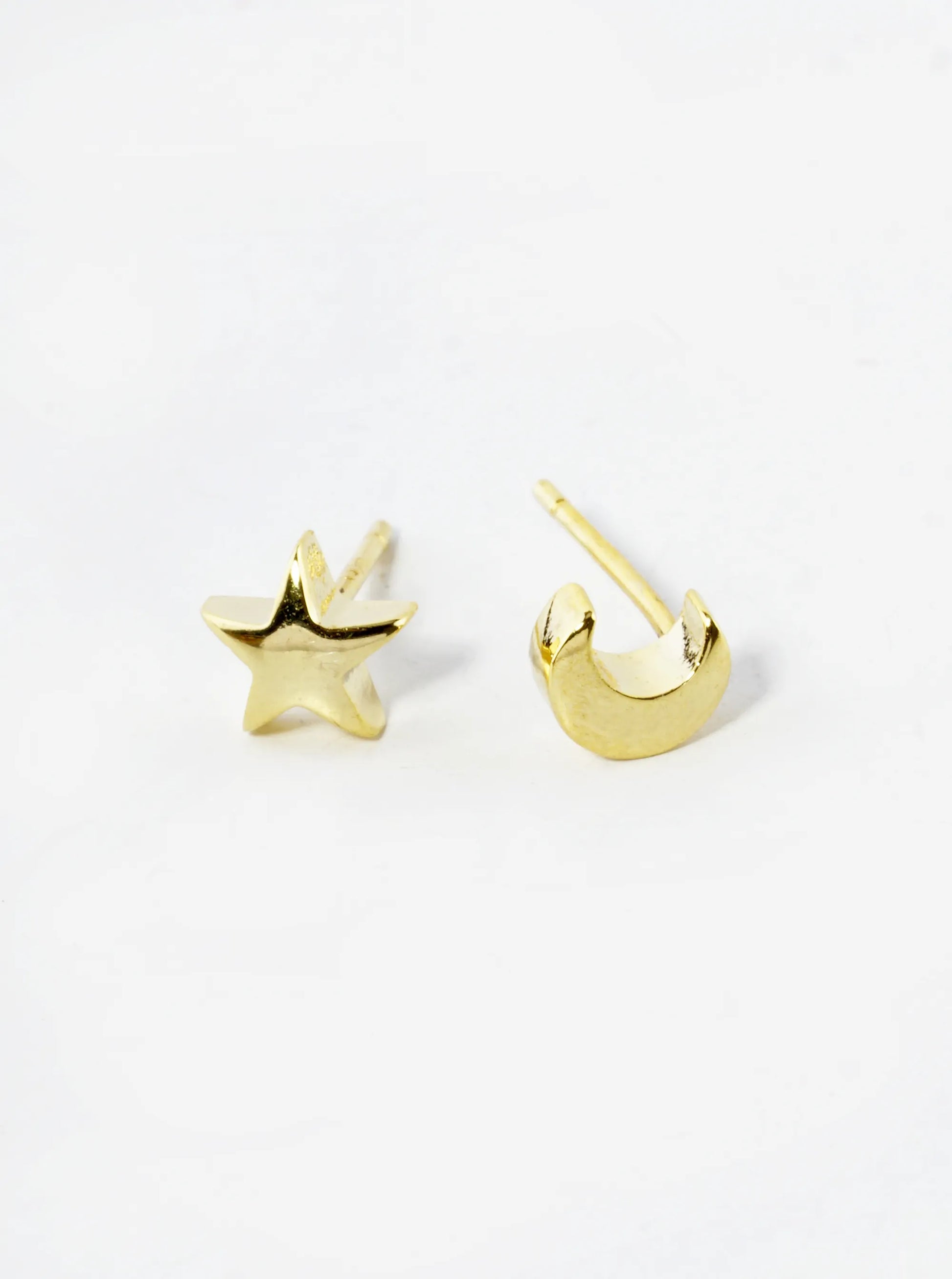 18K Gold Dipped Dainty 7mm Star And Moon Asymmetric Brass Stud Earrings