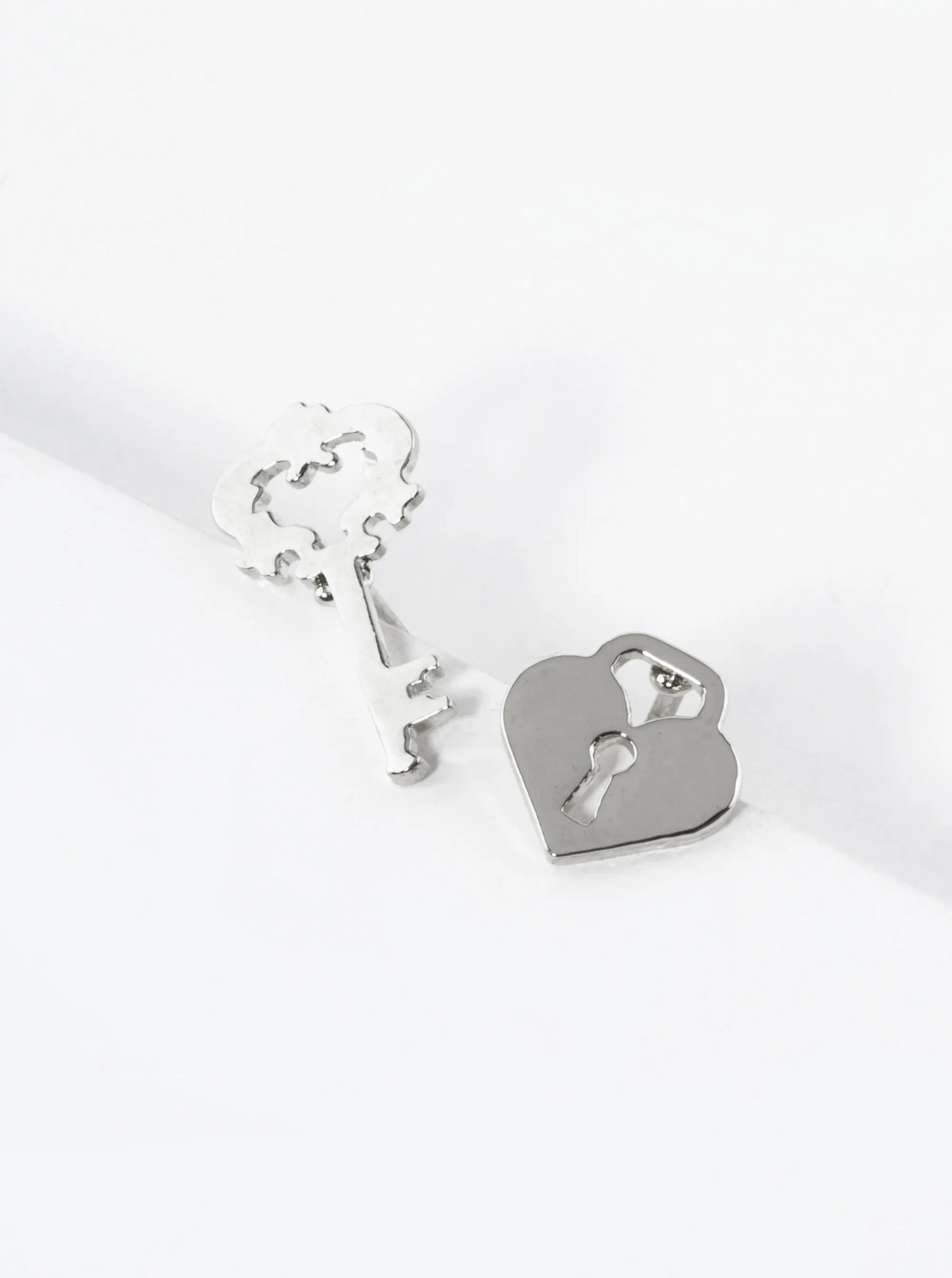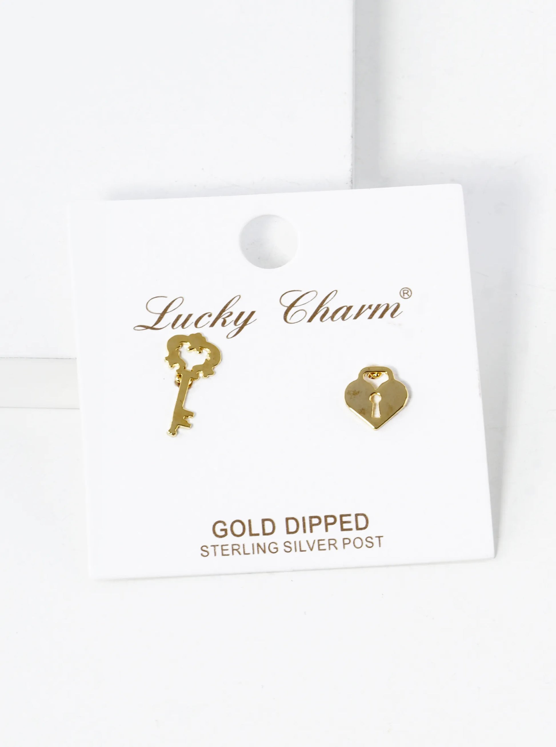 18K Gold Dipped Heart Lock And Key Asymmetric Brass Stud Earrings