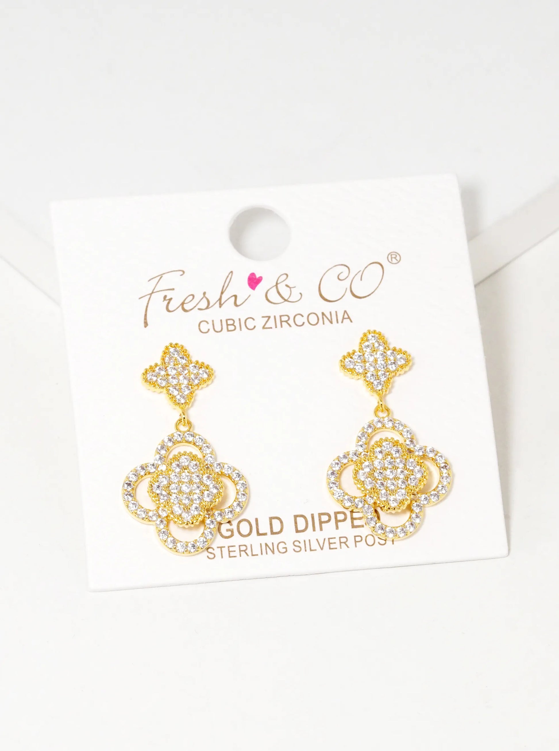 18K Gold Dipped Micro Pave Set Cubic Zirconia Double Quatrefoil Drop 925 Sterling Sliver Post Earrings