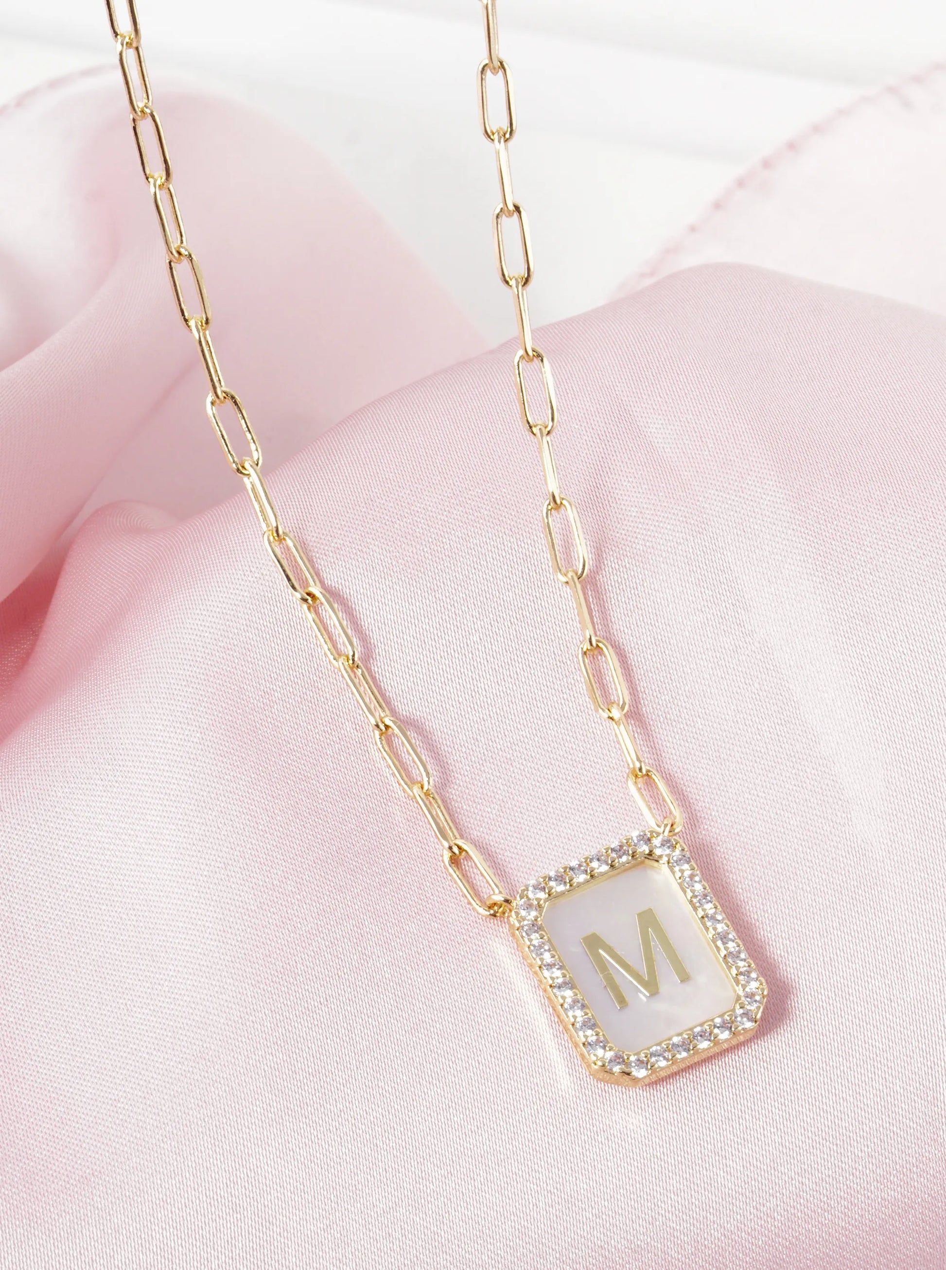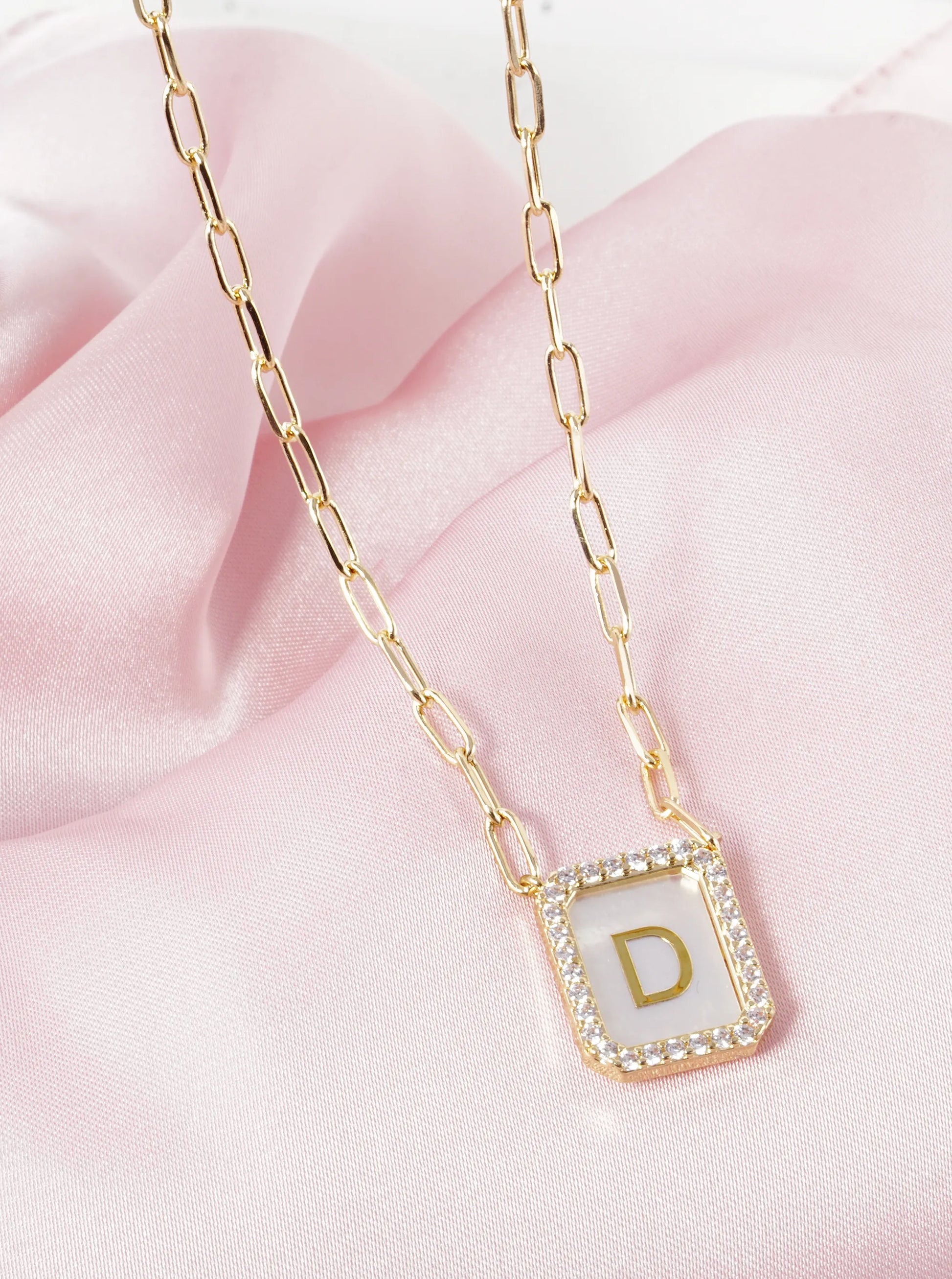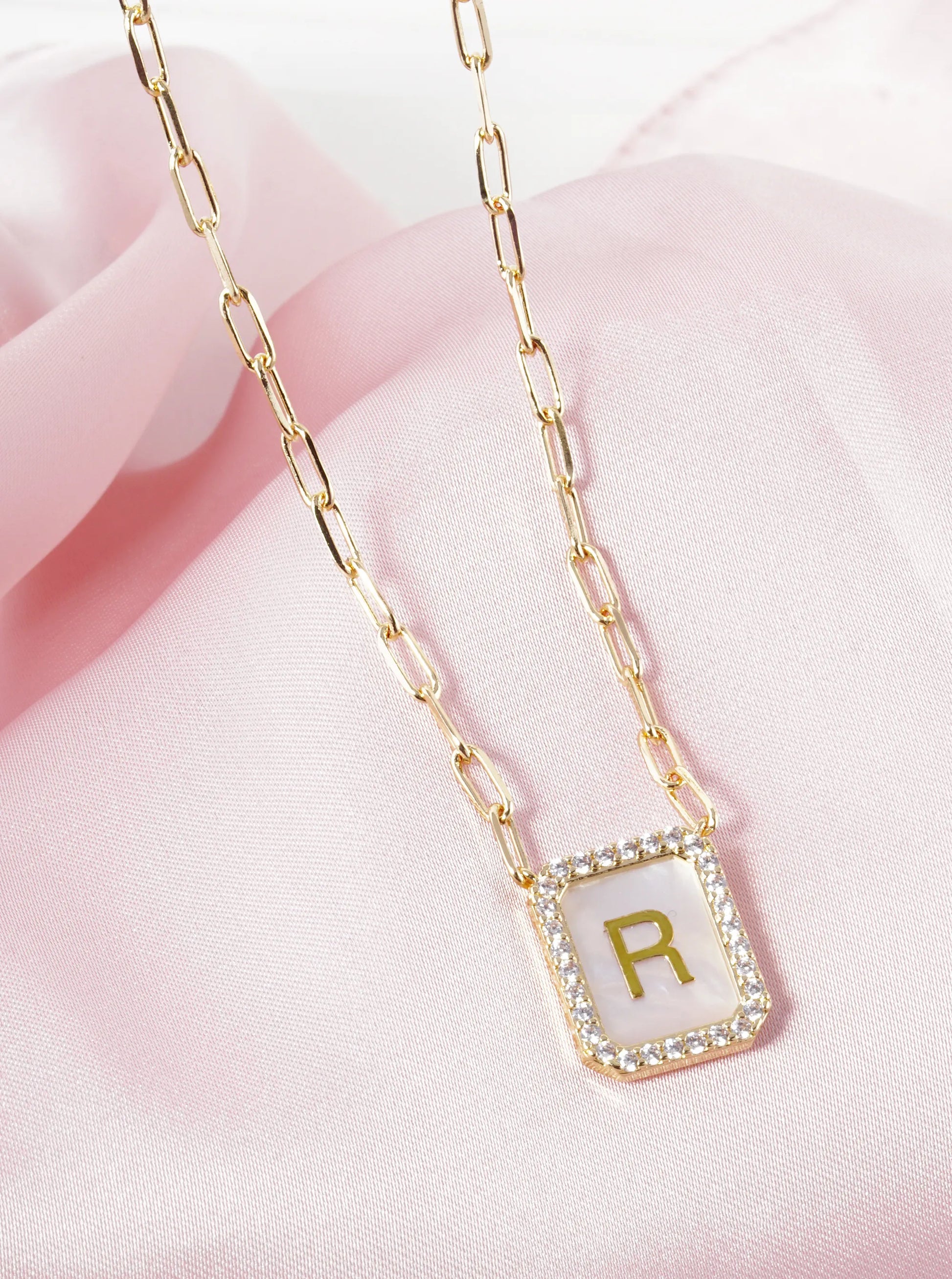 18K Gold Dipped Pave Set Cubic Zirconia Mother Of Pearl Initial Pendant Necklace