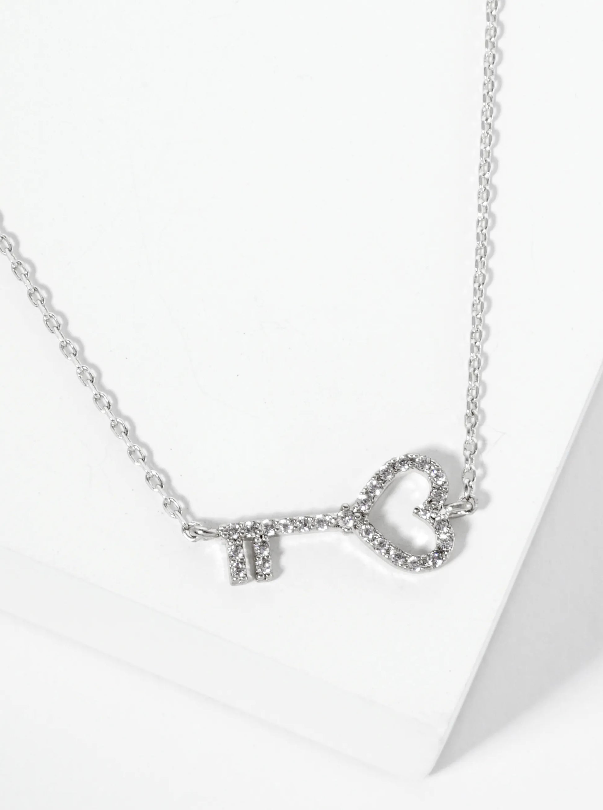 18K Gold Dipped Pave Set CZ Sideways Heart Key Pendant Necklace