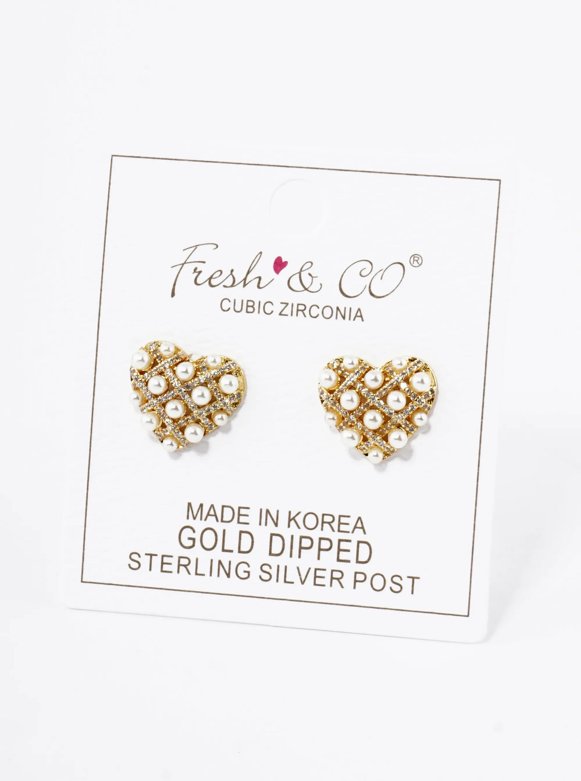 18K Gold Dipped Pearl Beaded Cubic Zirconia Heart Stud Earrings