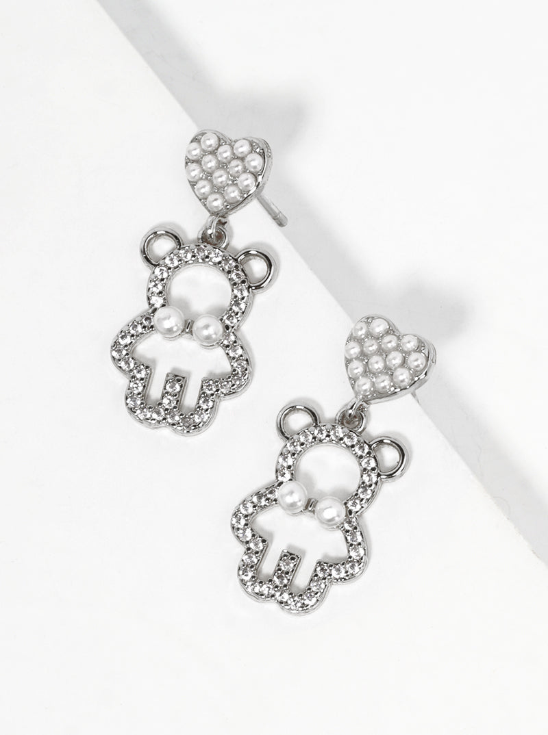 18K Gold Dipped Pearl Beaded Heart CZ Pave Bear Drop Dangle Post Earrings