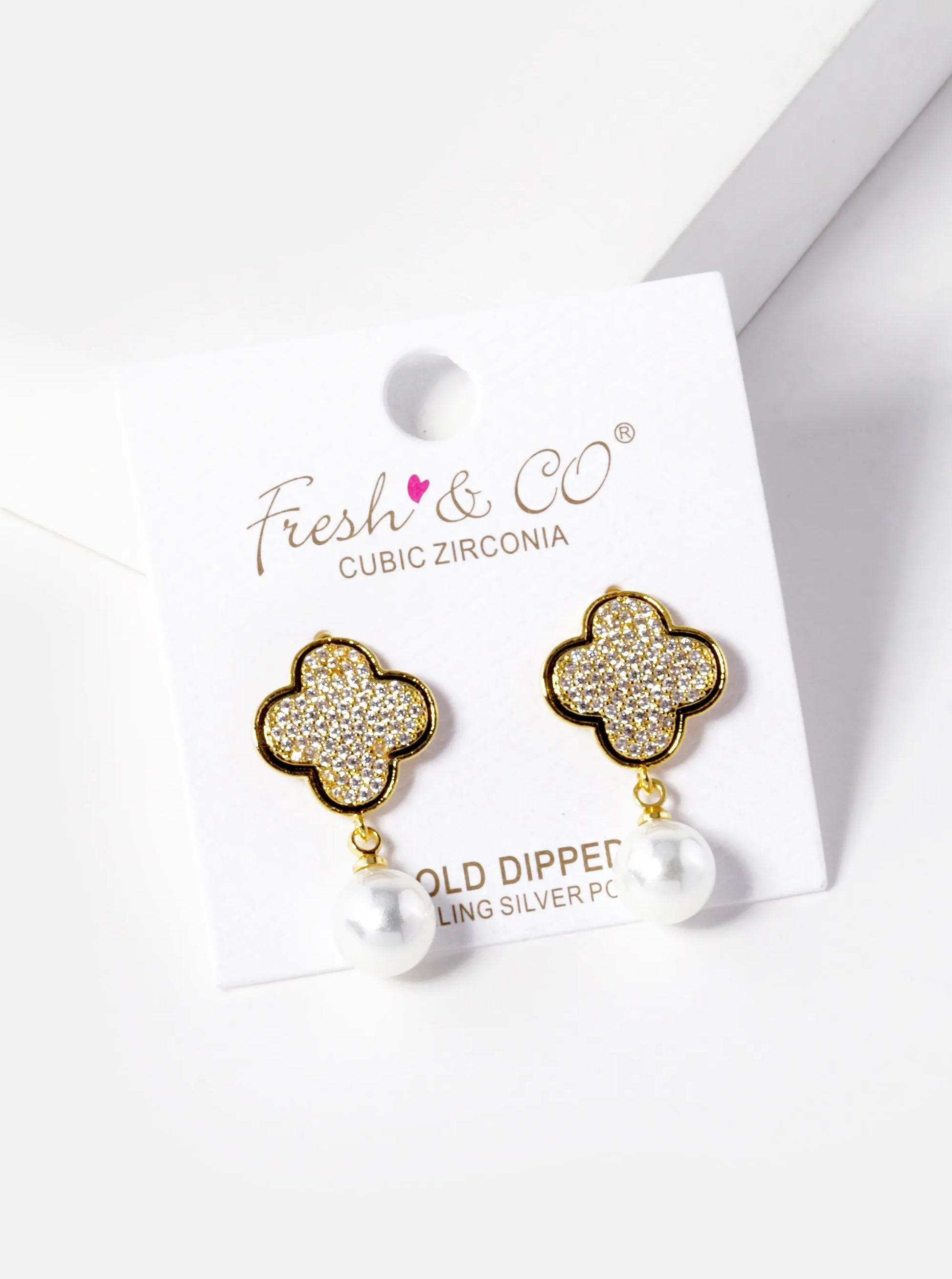 18K Gold Dipped Pearl Drop CZ Pave Quatrefoil Dangle 925 Sterling Silver Post Earrings