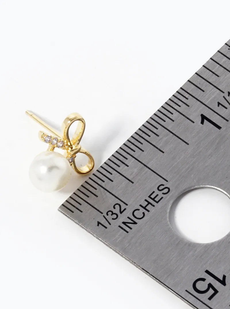 18K Gold Dipped Pearl Drop CZ Pave Ribbon Bow Stud Earrings