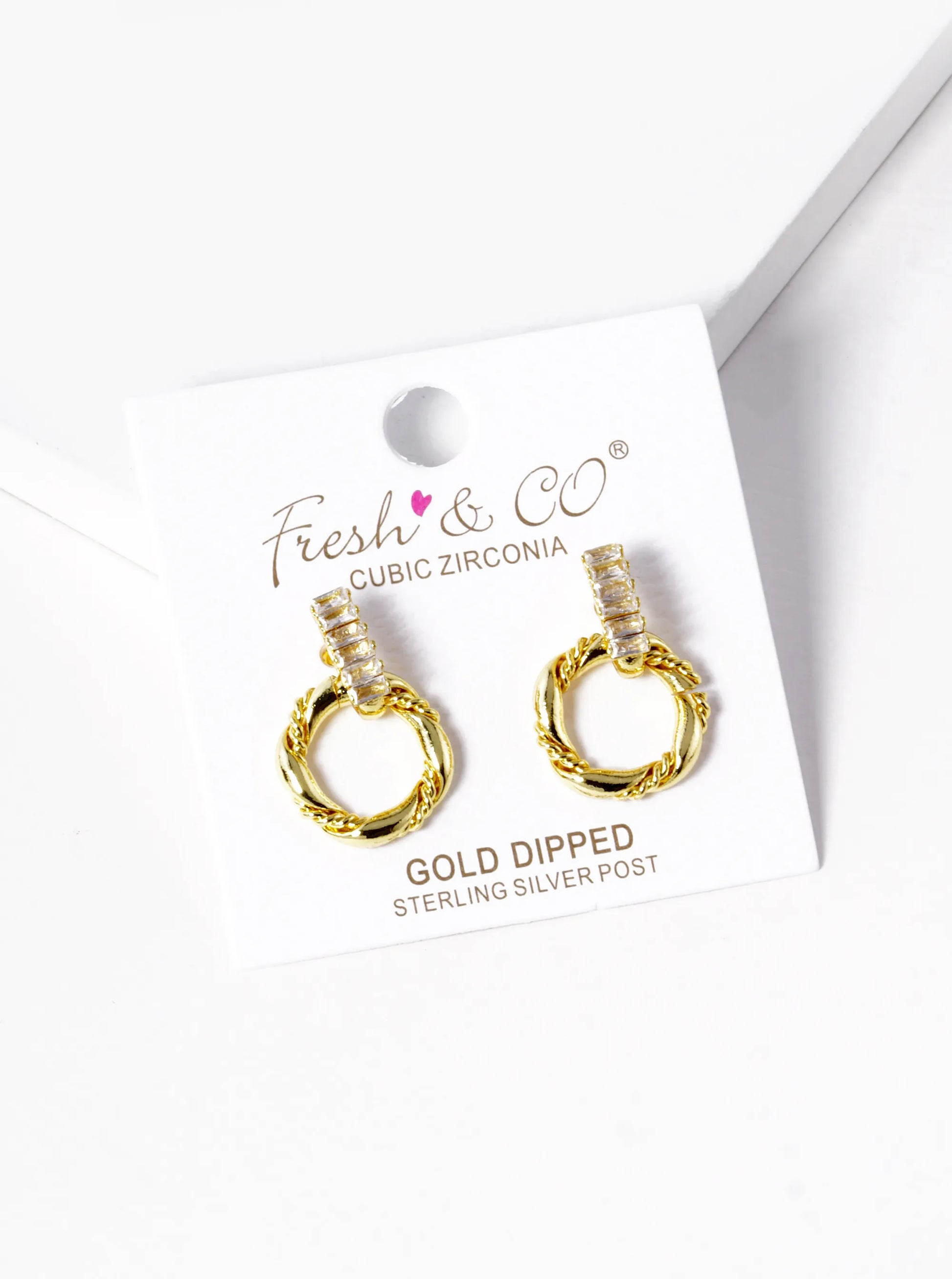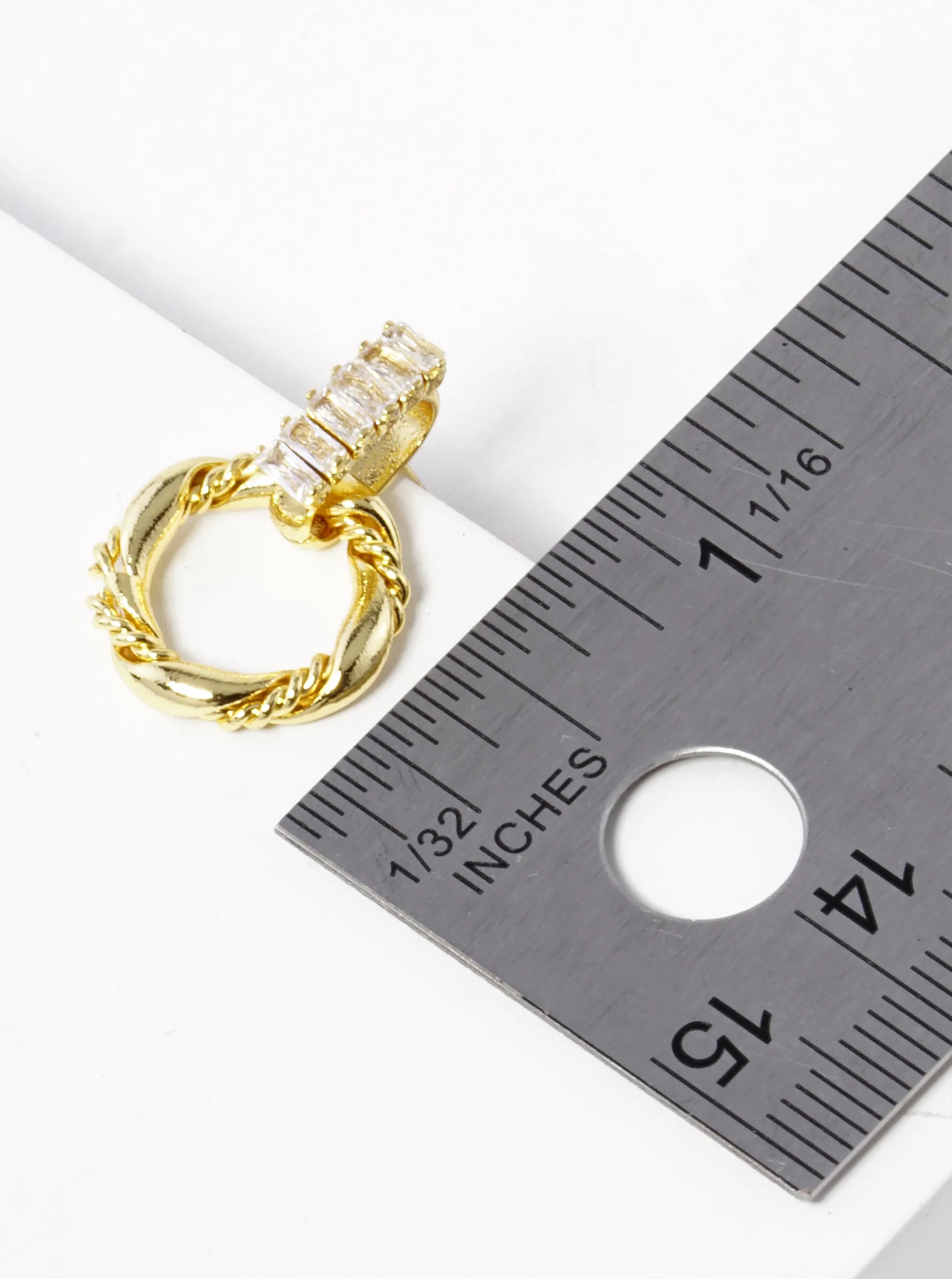 18K Gold Dipped Textured Circle Drop Baguette CZ Door Knocker Earrings