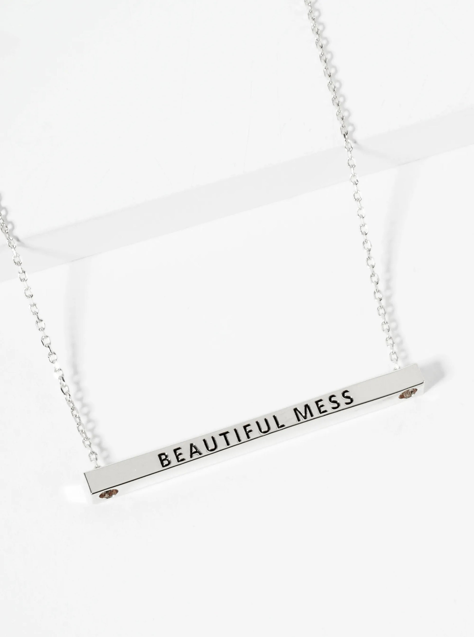 Beautiful Mess Engraved 18K Gold Dipped Horizontal Brass Bar Pendant Inspirational Necklace