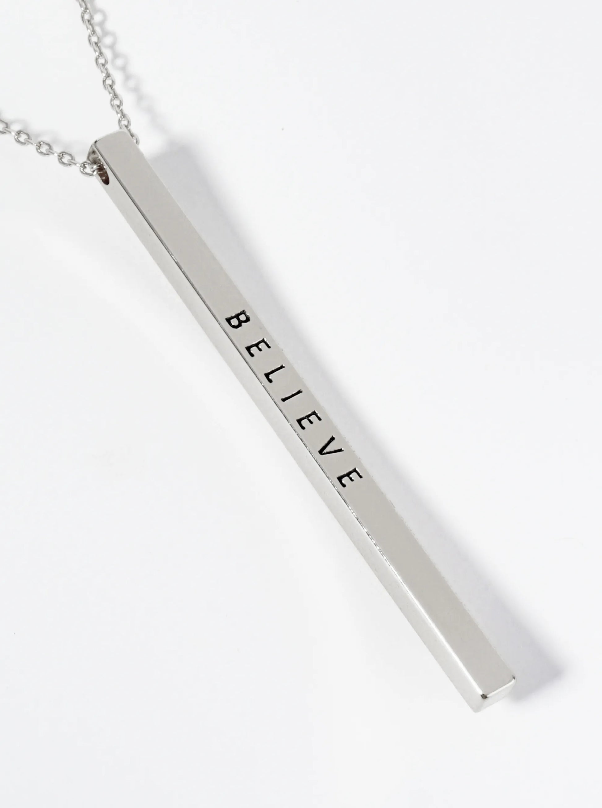 Believe Engraved Vertical Bar Pendant Inspirational Necklace