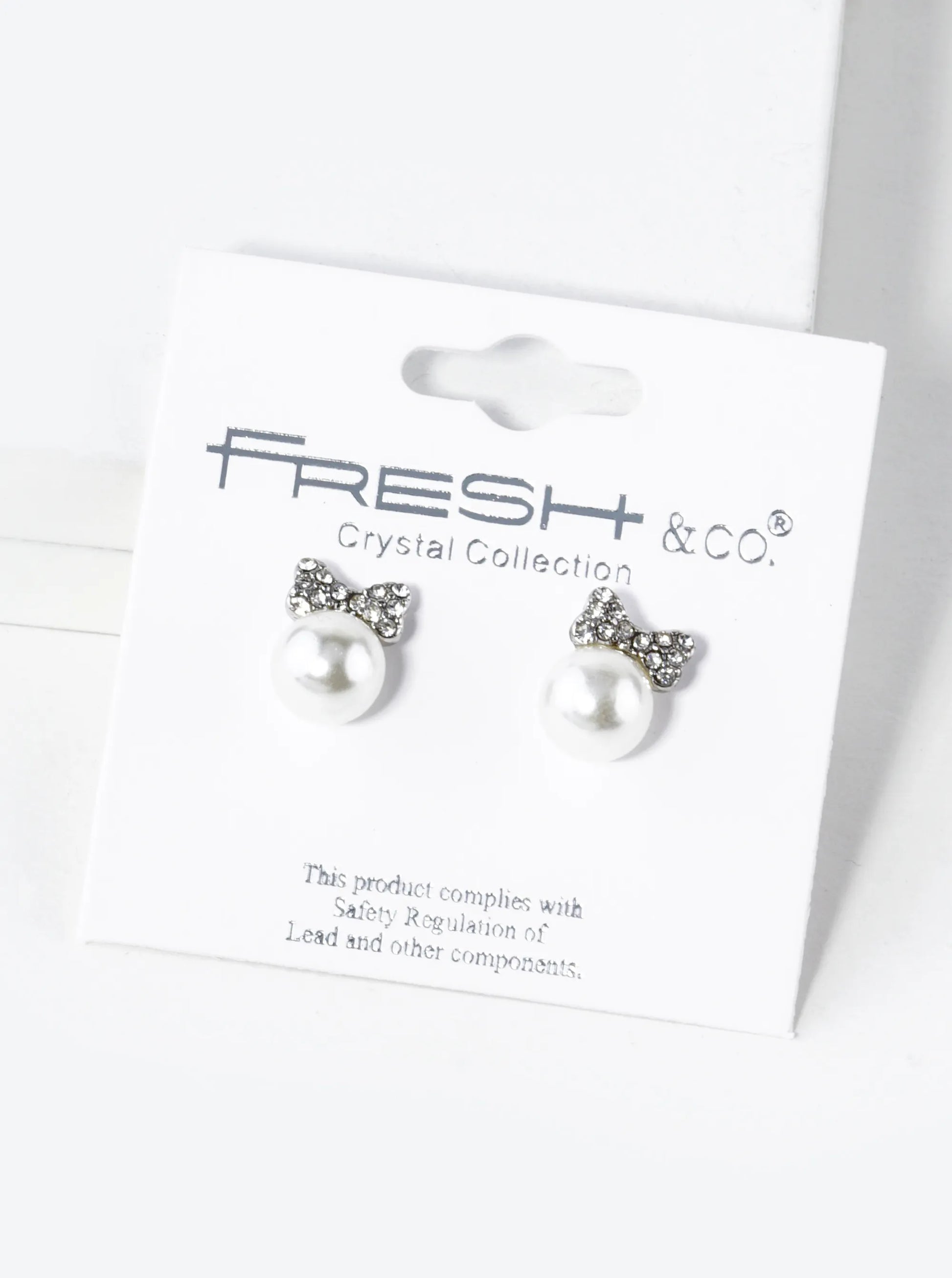 Crystal Pave Tiny Ribbon Bow With Pearl Bead Stud Earrings