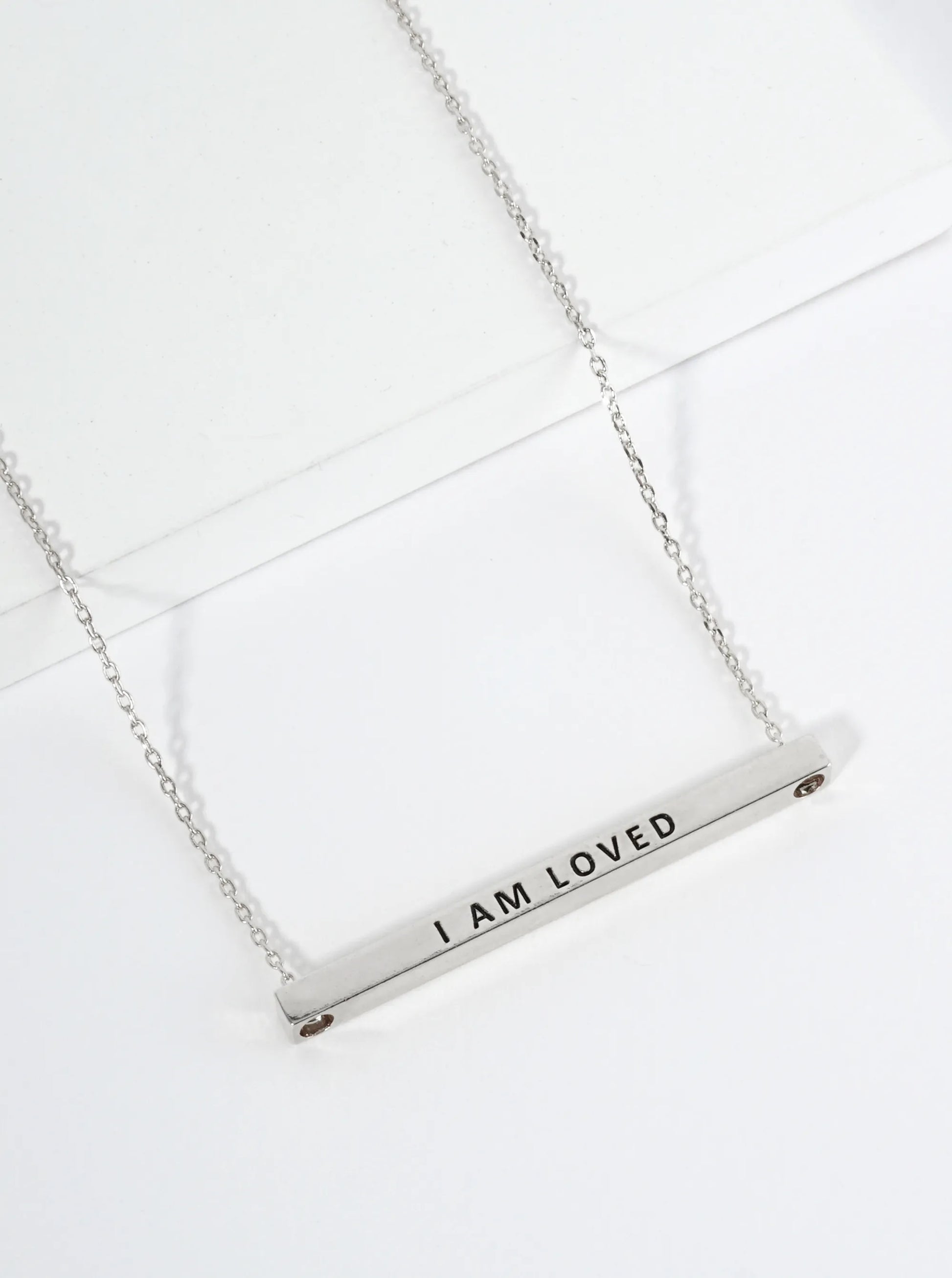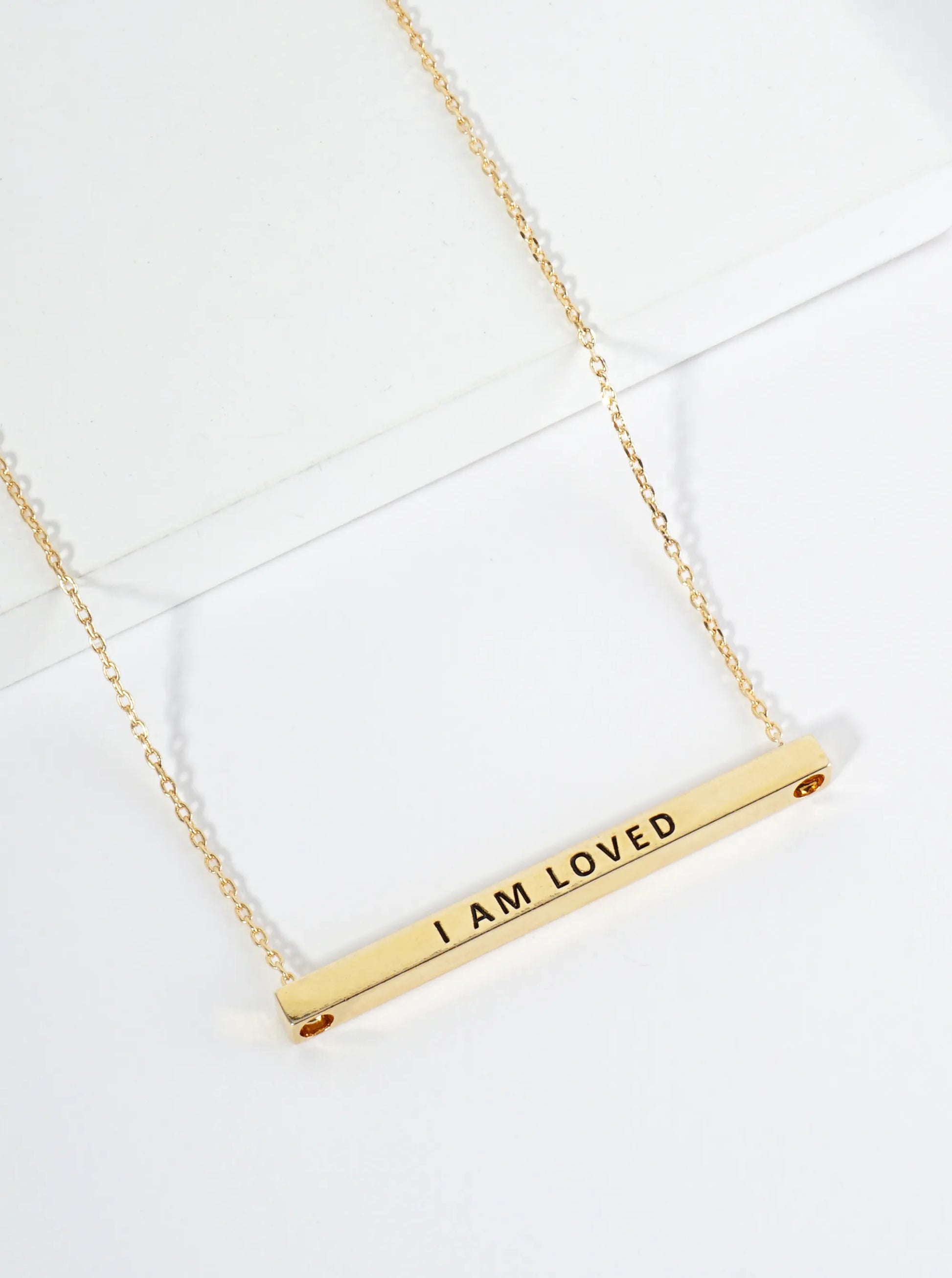 I Am Loved Engraved 18K Gold Dipped Horizontal Brass Bar Pendant Inspirational Necklace