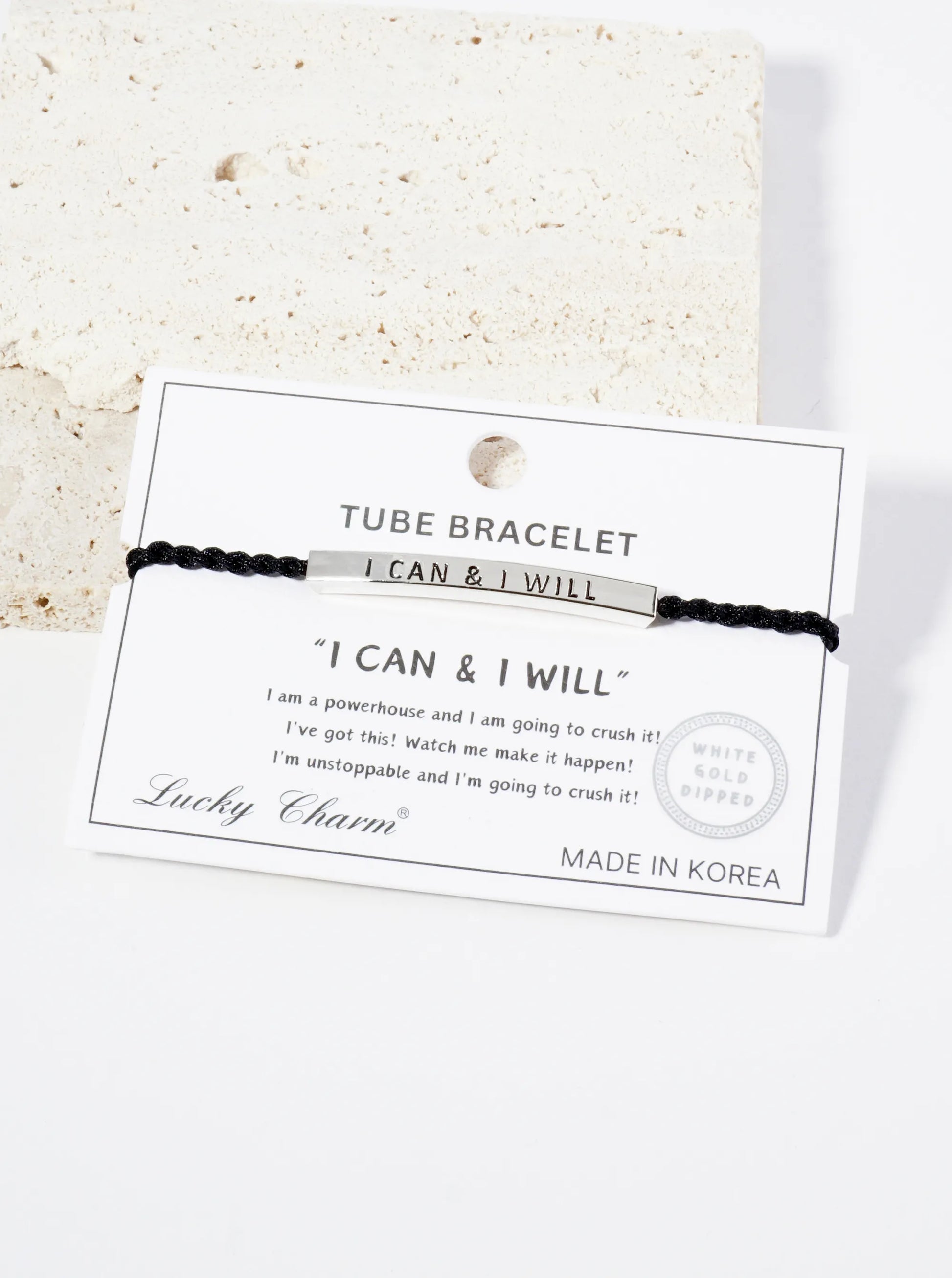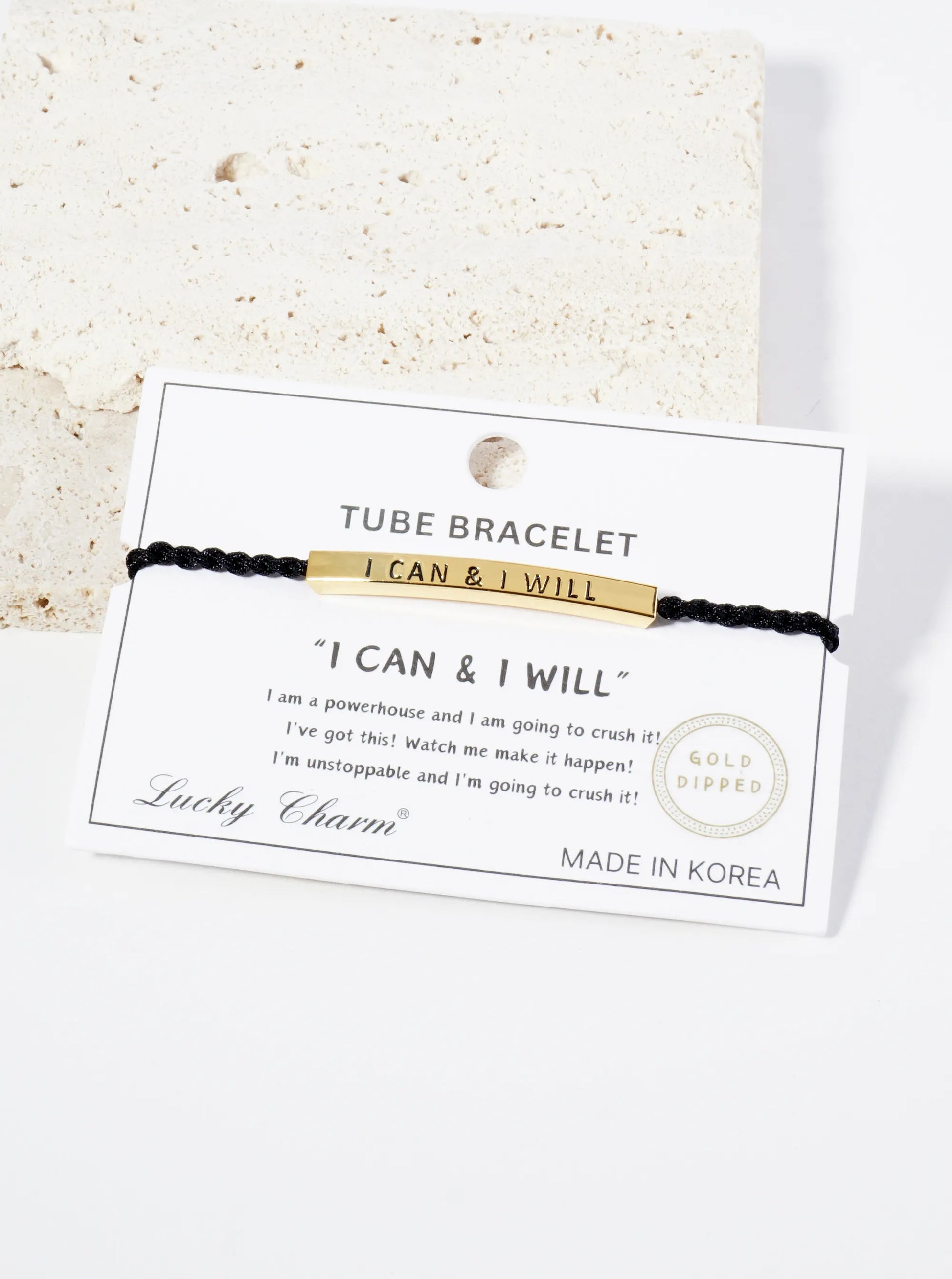 I Can And I Will Engraved 18K Gold Dipped Curved Brass Tube Bar Adjustable Pull Tie Bracelet