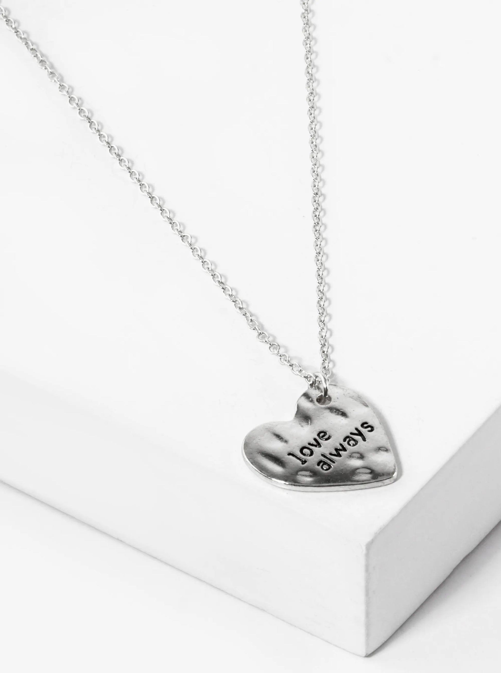 Love Always Engraved Sideways Hammered Metal Heart Pendant Necklace