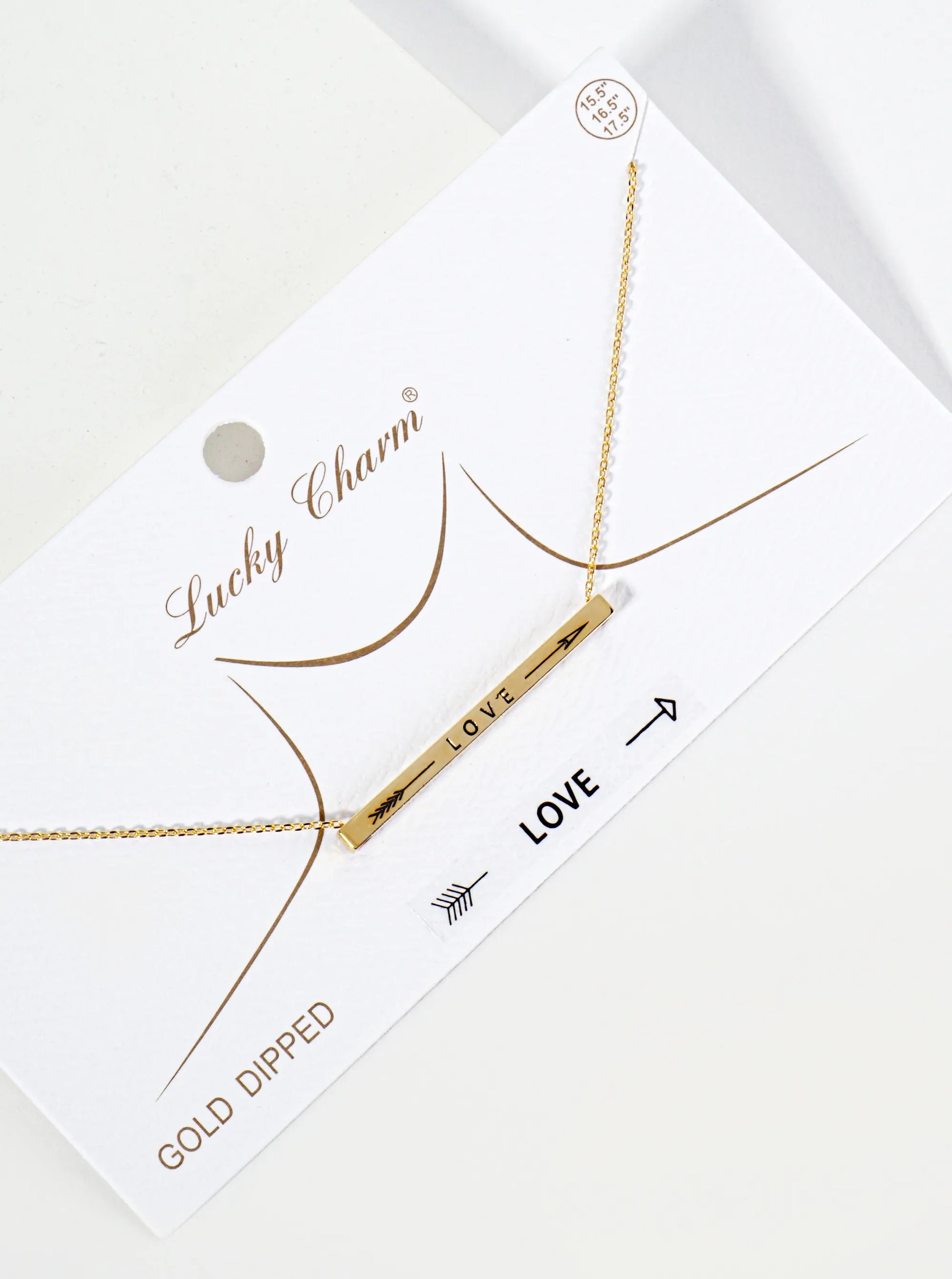 Love Arrow Engraved 18K Gold Dipped Horizontal Brass Bar Pendant Inspirational Necklace