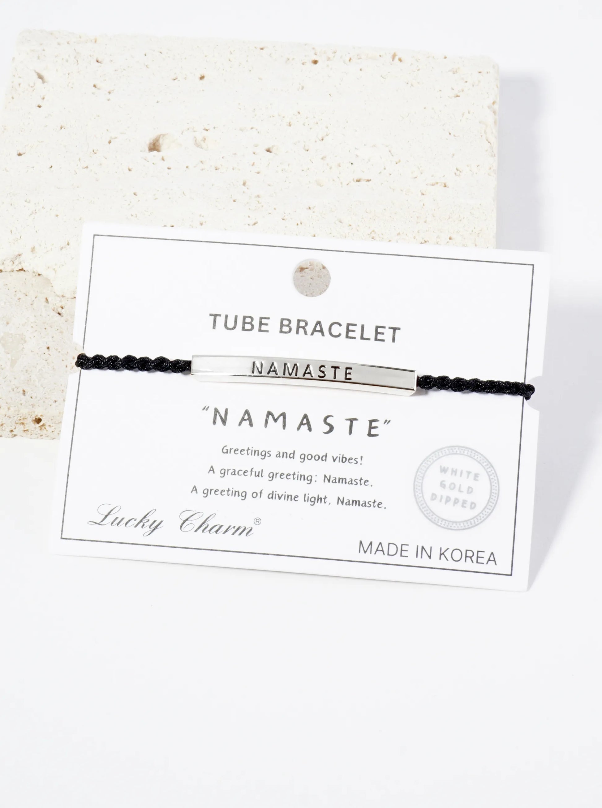 Namaste Engraved 18K Gold Dipped Curved Brass Tube Bar Adjustable Pull Tie Bracelet