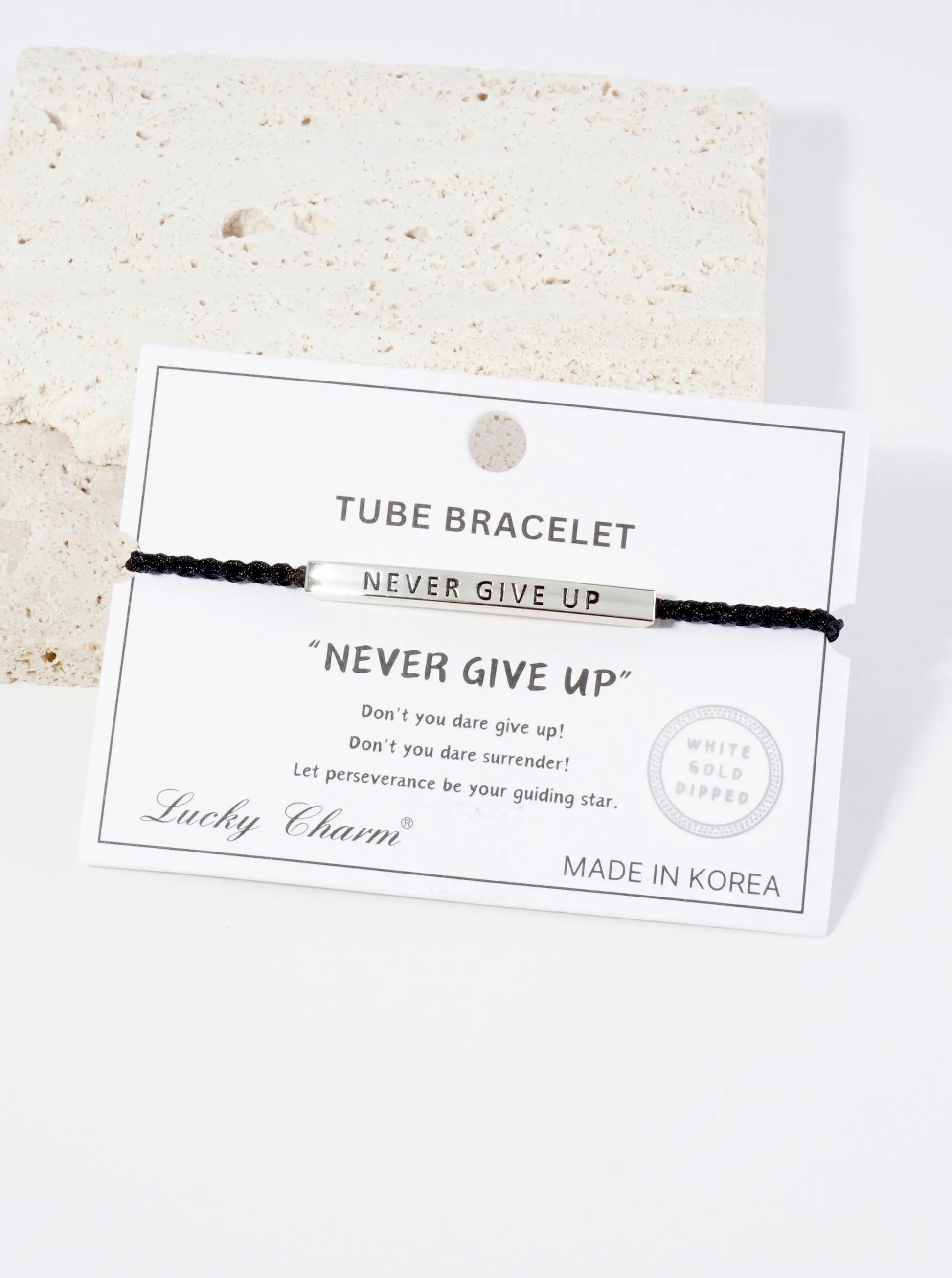 Never Give Up Engraved 18K Gold Dipped Curved Brass Tube Bar Adjustable Pull Tie Bracelet