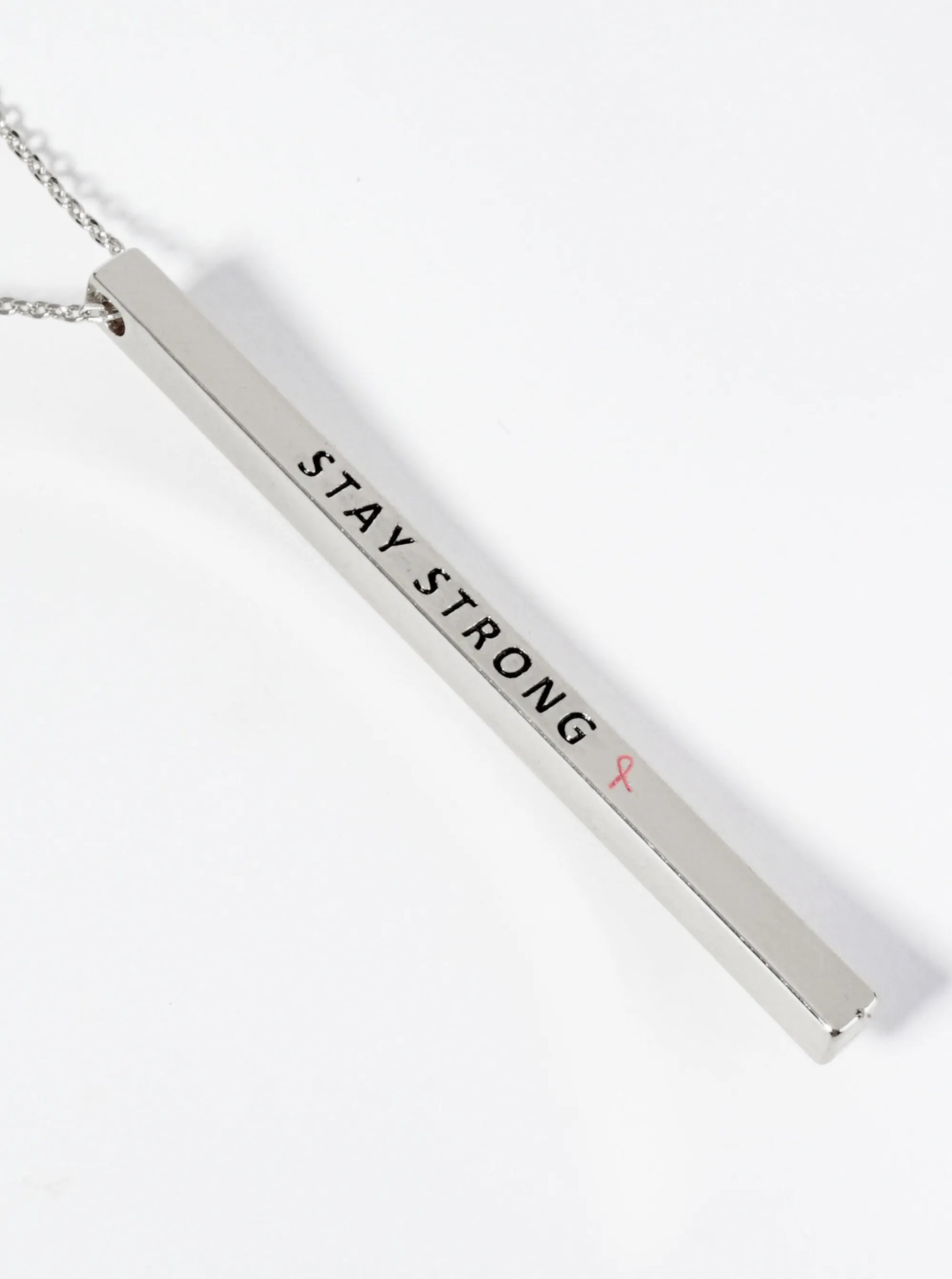 Stay Strong Pink Ribbon Engraved Vertical Bar Pendant Inspirational Necklace