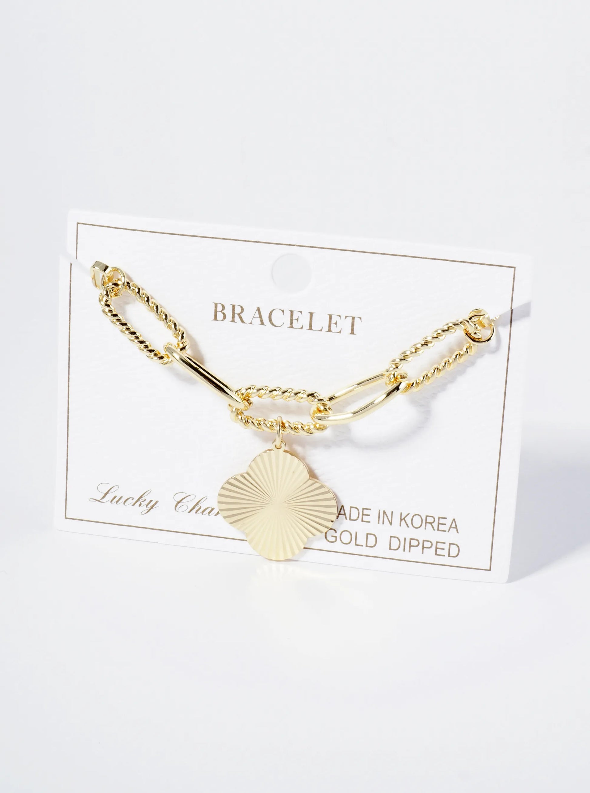 Sunburst Texture Quatrefoil Charm 18K Gold Dipped Link Chain Bracelet