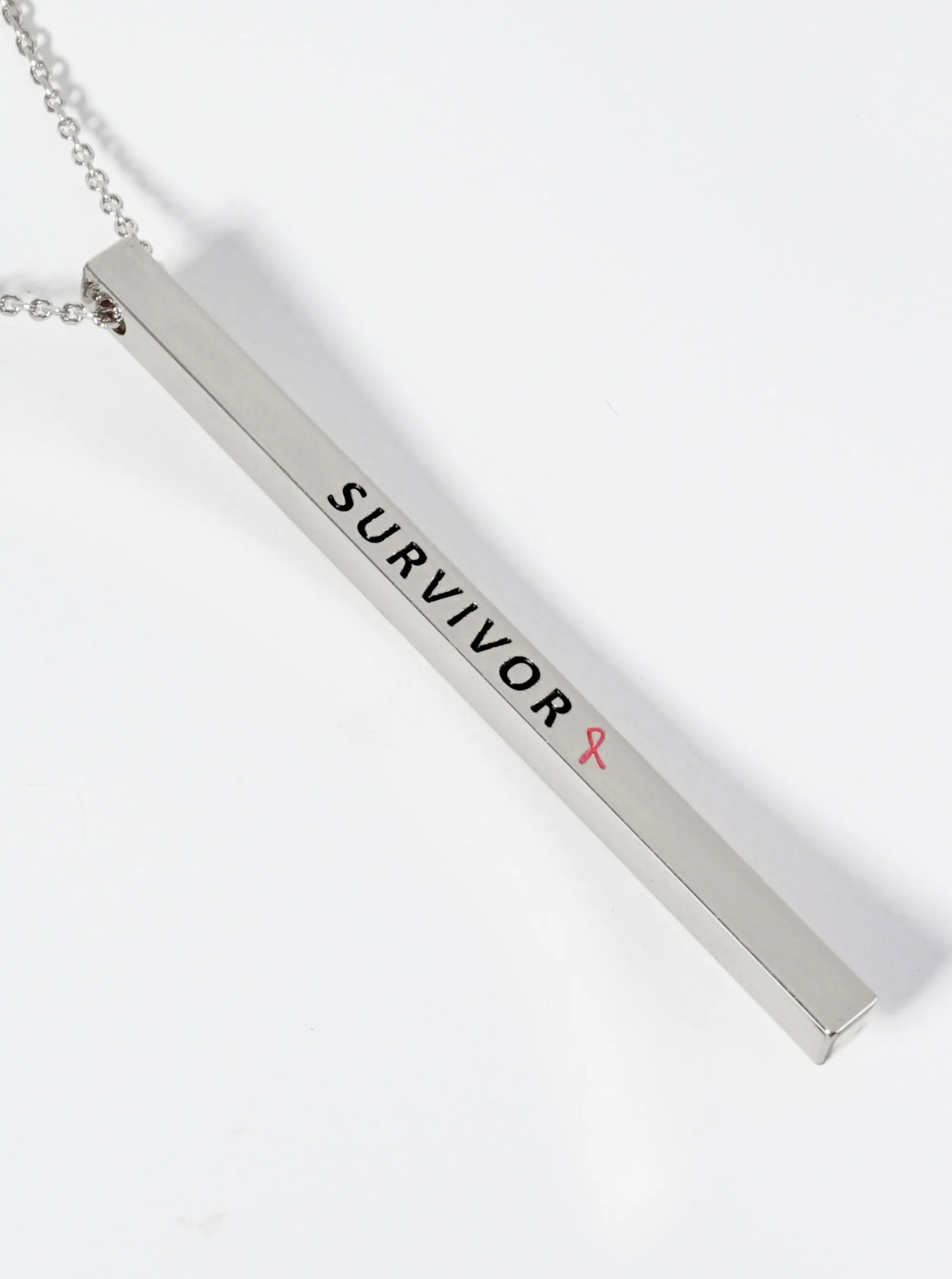 Survivor Pink Ribbon Engraved Vertical Bar Pendant Inspirational Necklace