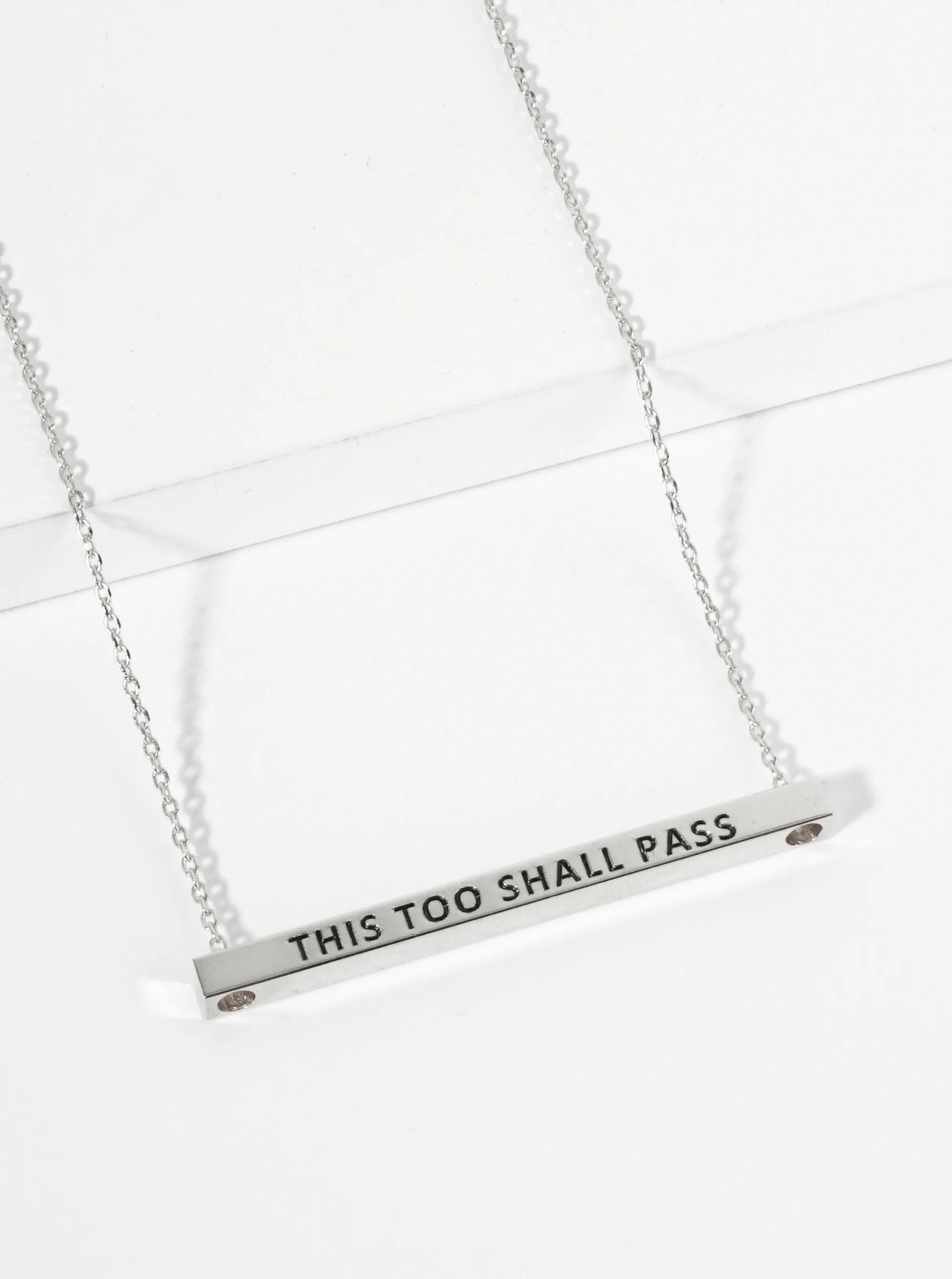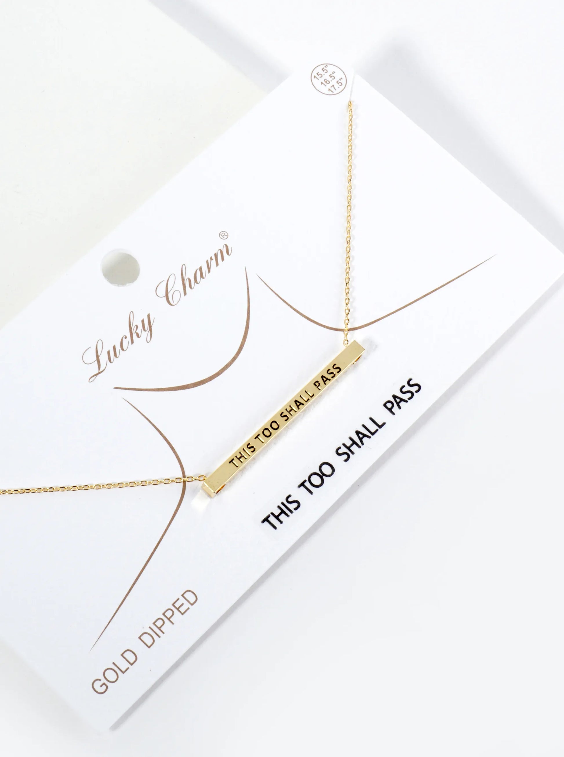 This Too Shall Pass Engraved 18K Gold Dipped Horizontal Brass Bar Pendant Inspirational Necklace
