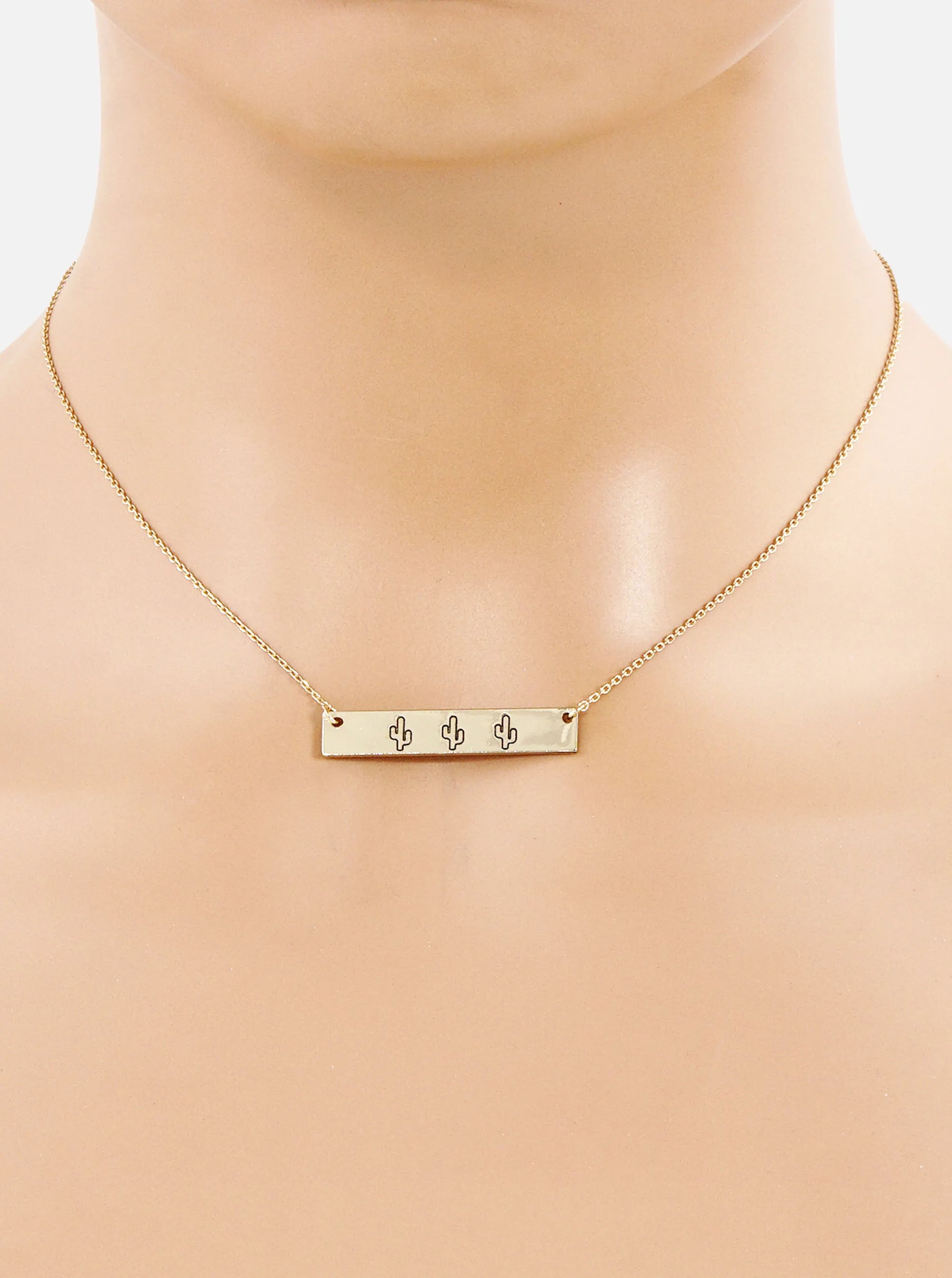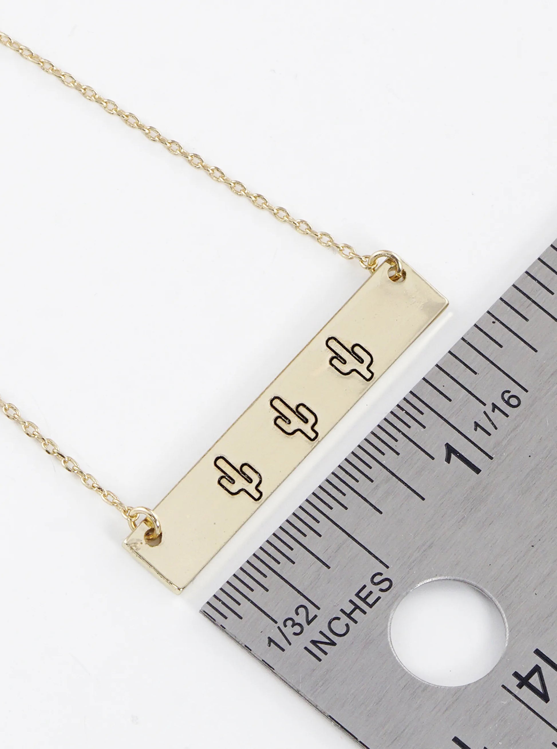 Three Cactus Engraved Horizontal Bar Pendant Necklace