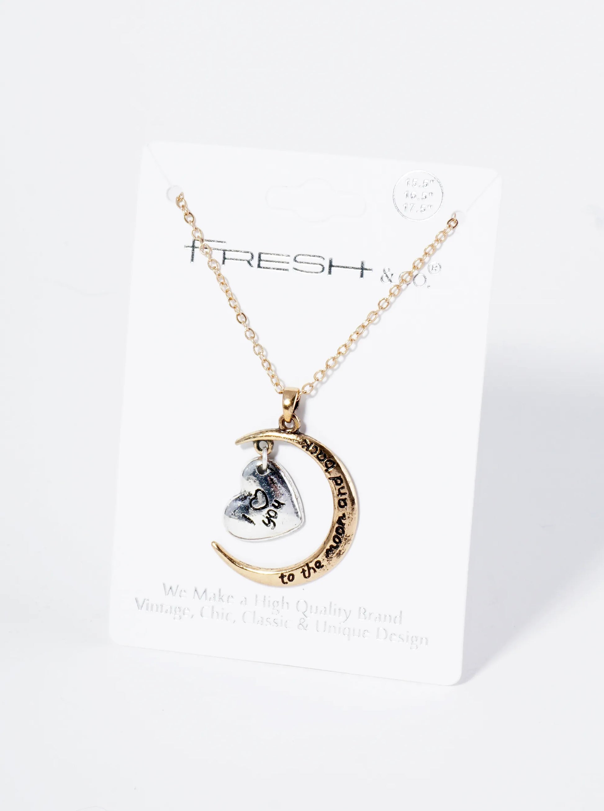 Two-Tone Sentimental Phrase Engraved Heart Embraced Moon Pendant Necklace