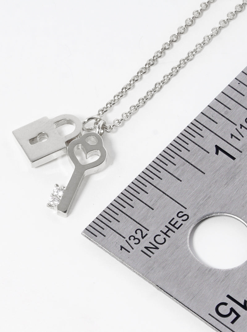 White Gold Dipped CZ Padlock And Heart Key Pendant Delicate Necklace
