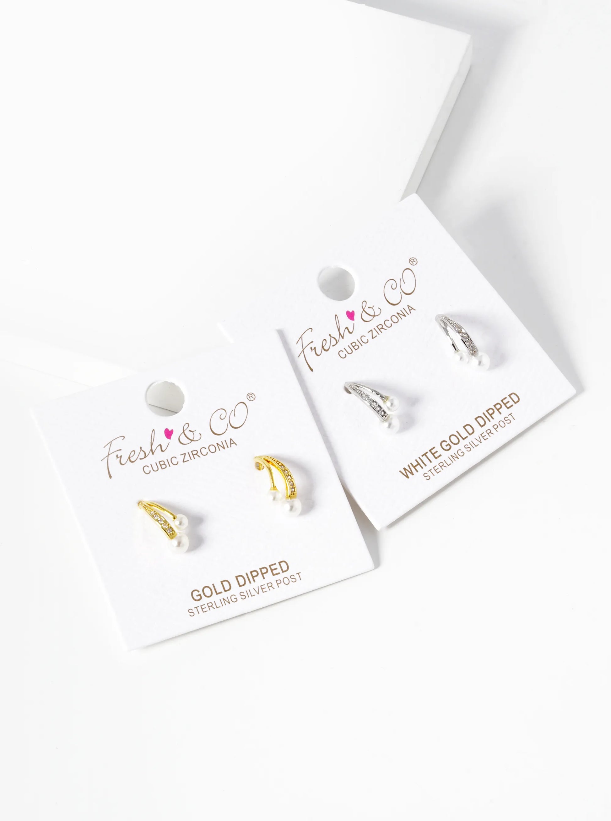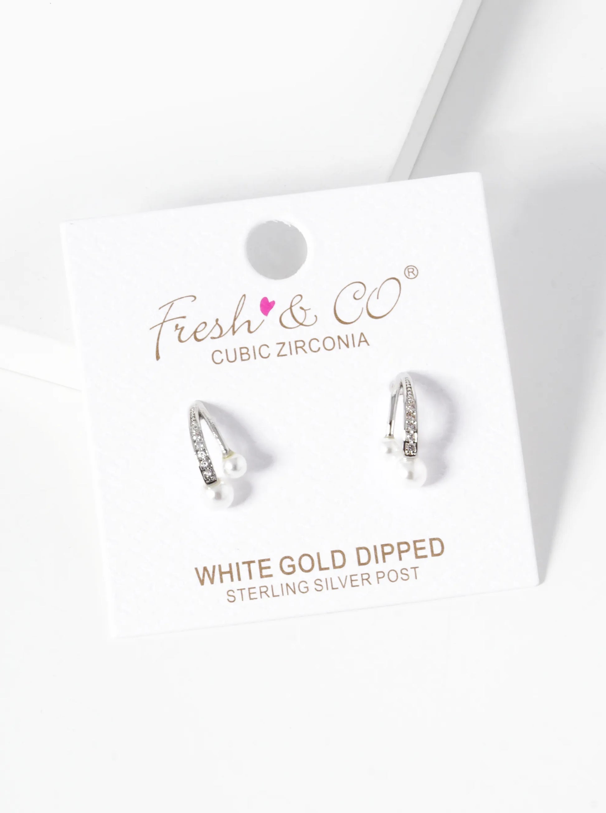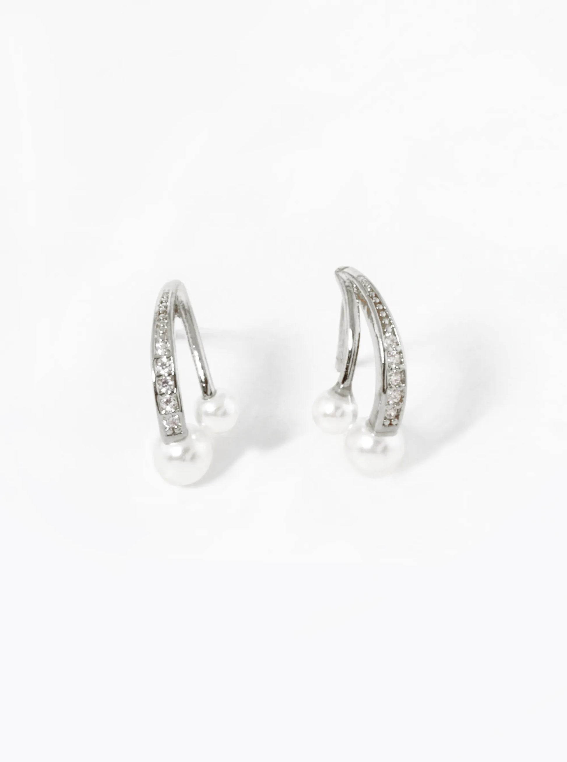 White Gold Dipped Pearl CZ Pave Curved Double Bar Stud Earrings