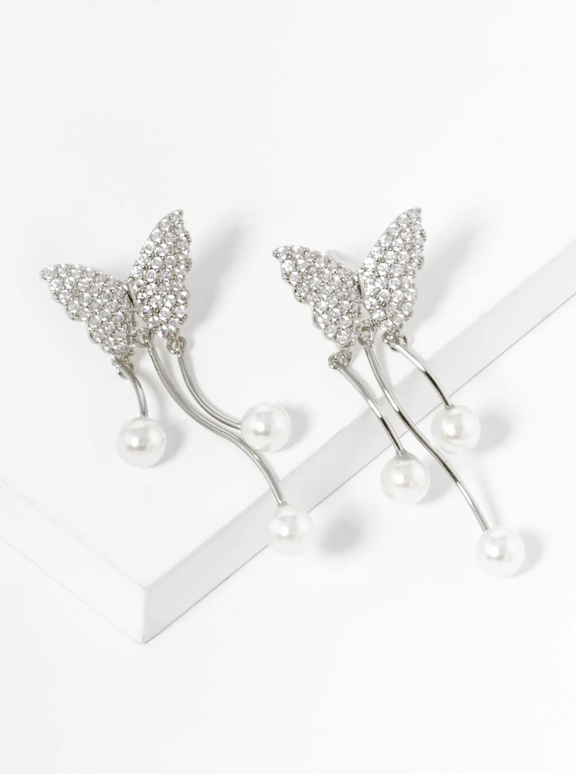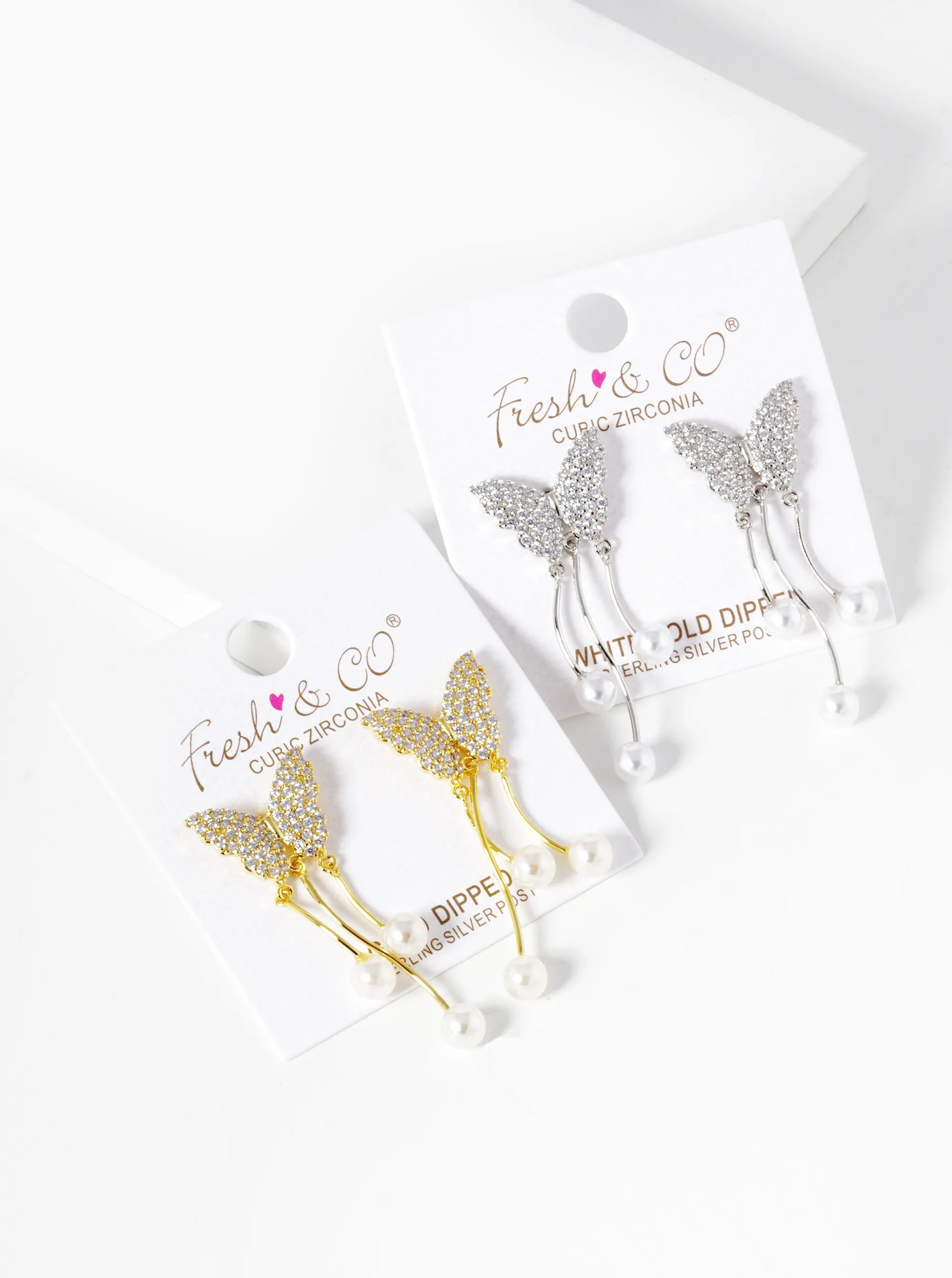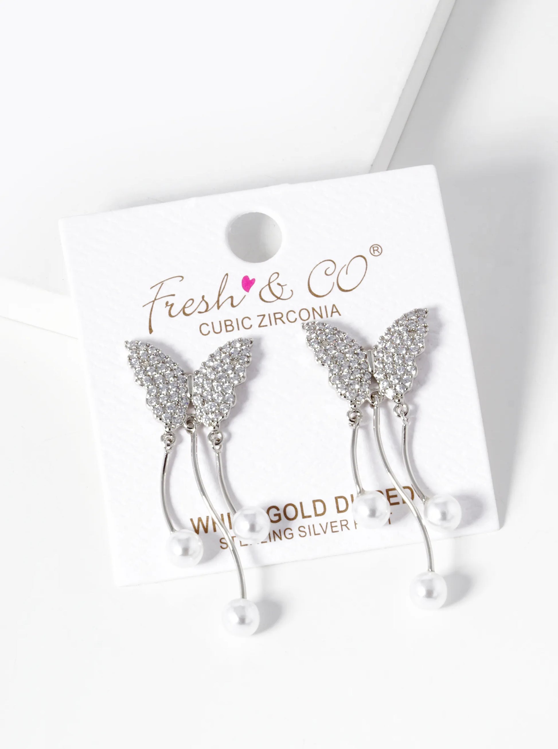 White Gold Dipped Pearl Drop CZ Pave Butterfly Dangle Earrings