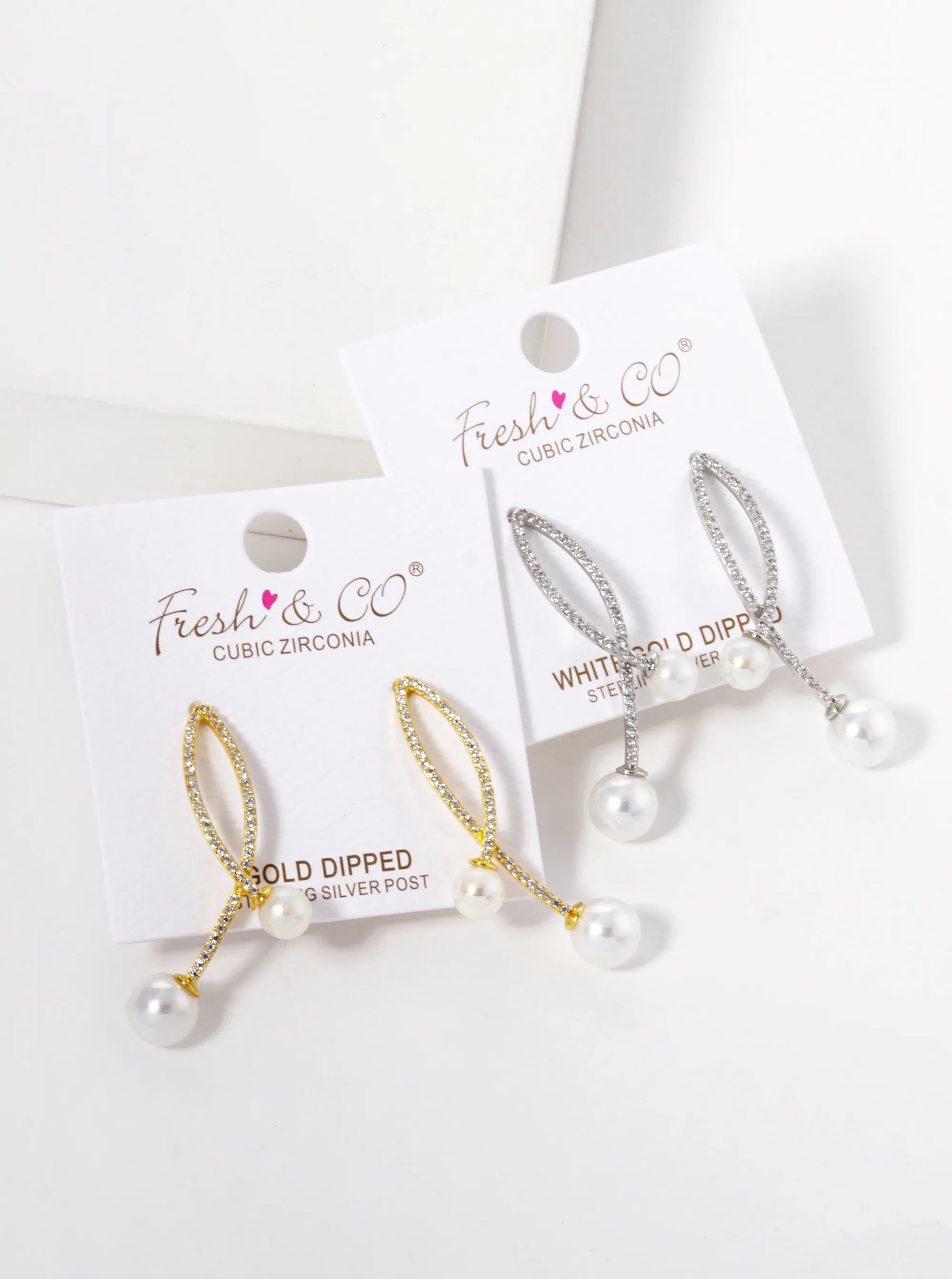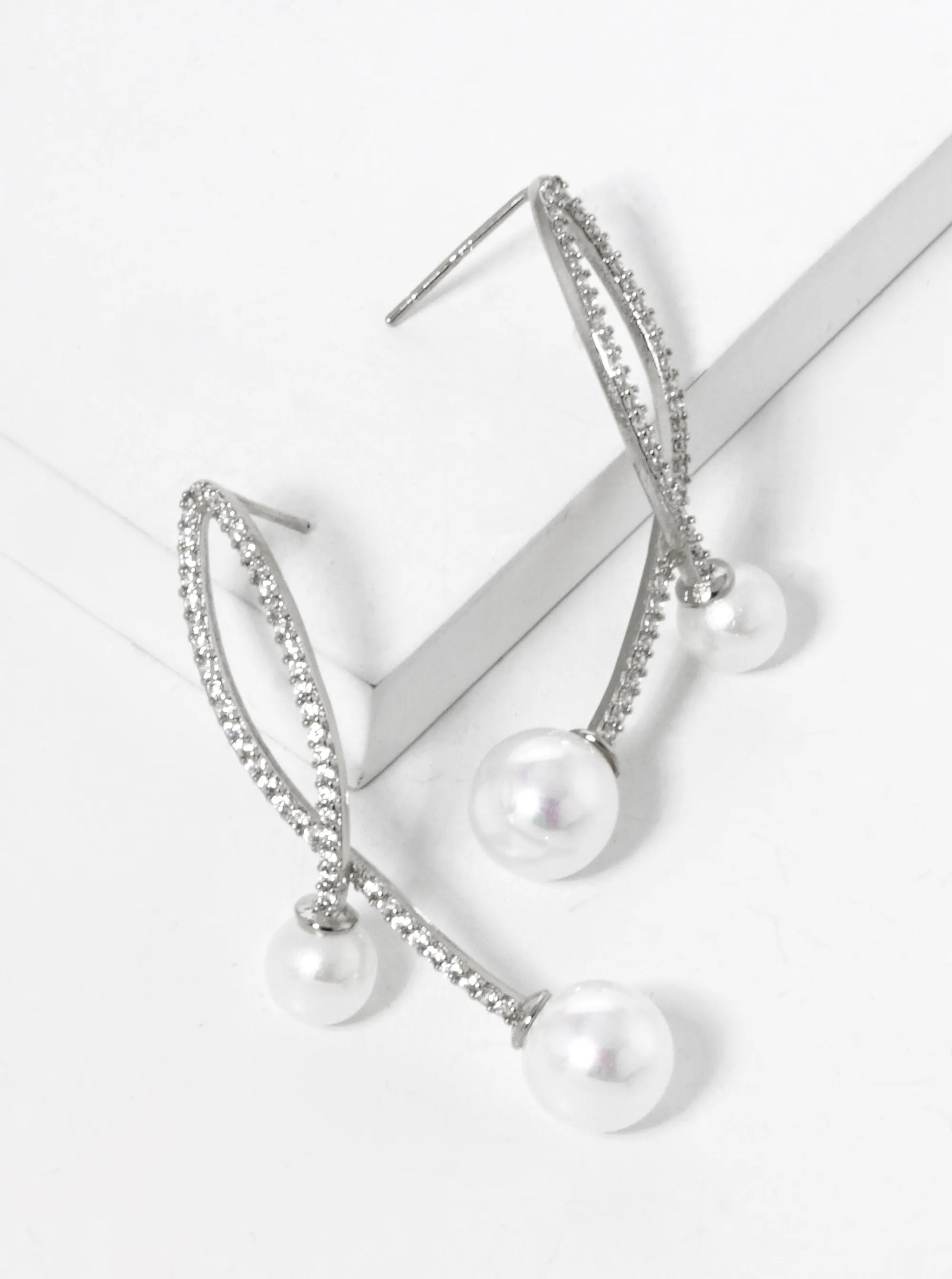 White Gold Dipped Pearl Drop CZ Pave Curved Double Bar Post Earrings
