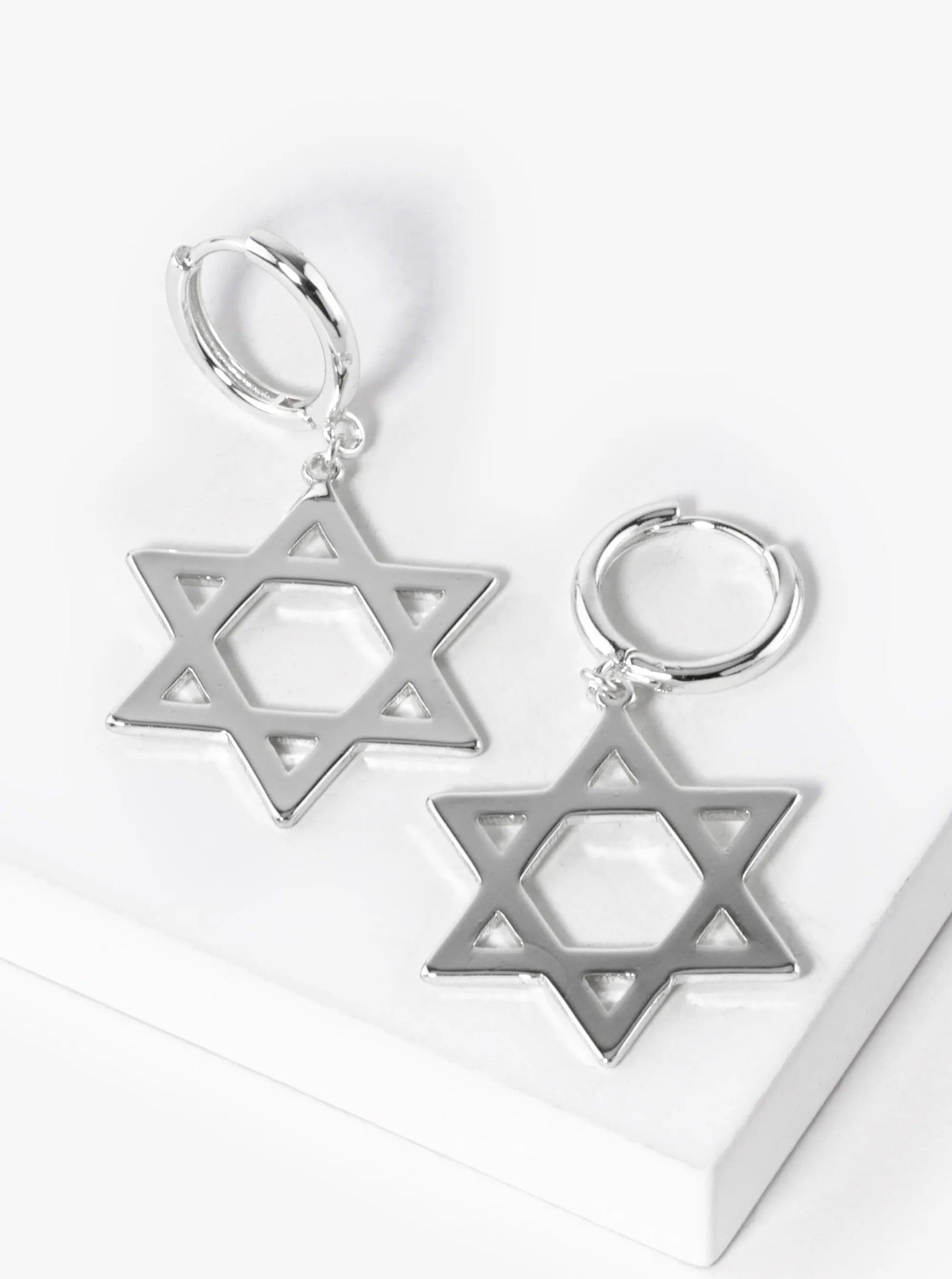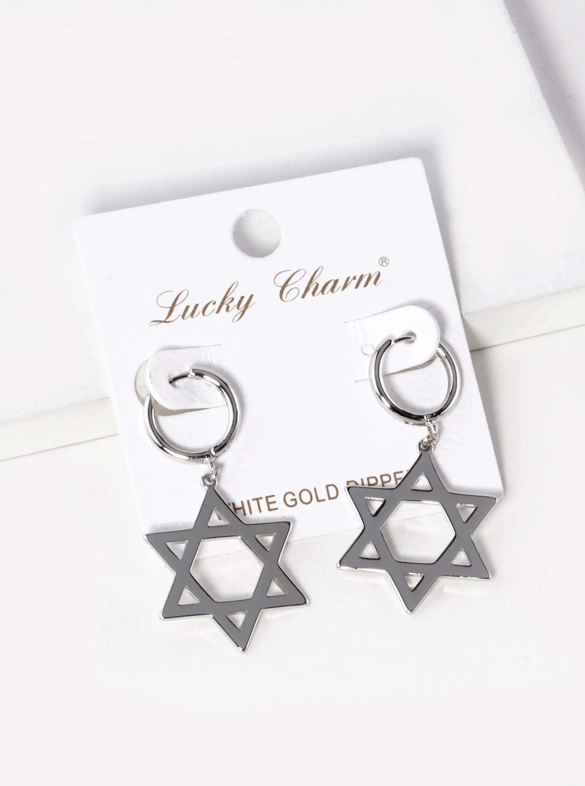 White Gold Dipped Star Of David Drop 12mm Huggie Hoop Earrings
